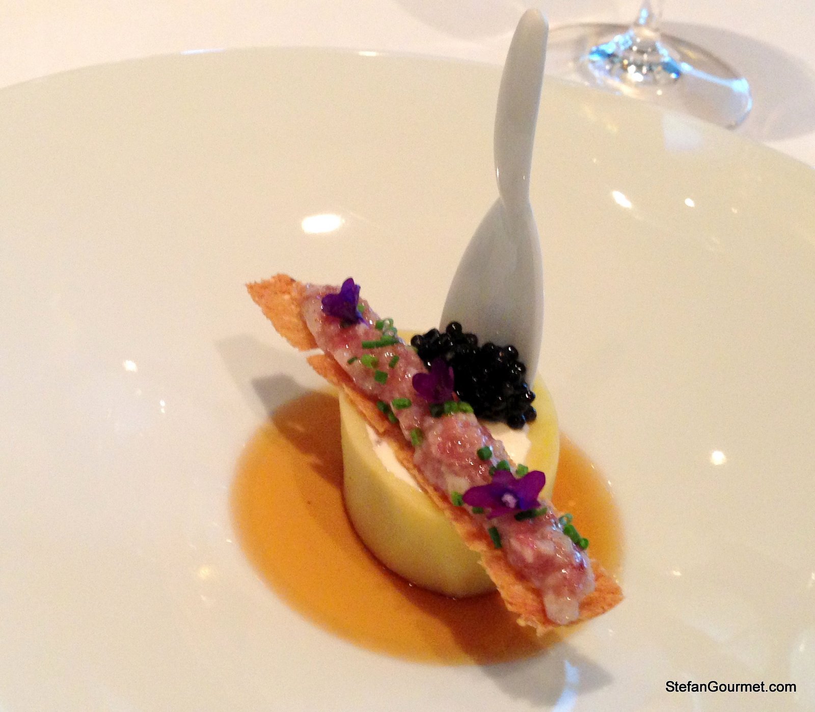Tartare of Lozère veal with caviar, and a ‘bone’ made from potato. Wonderful presentation, flavors, and textures. Paired well with an Australian sauvignon-semillon. 9/10