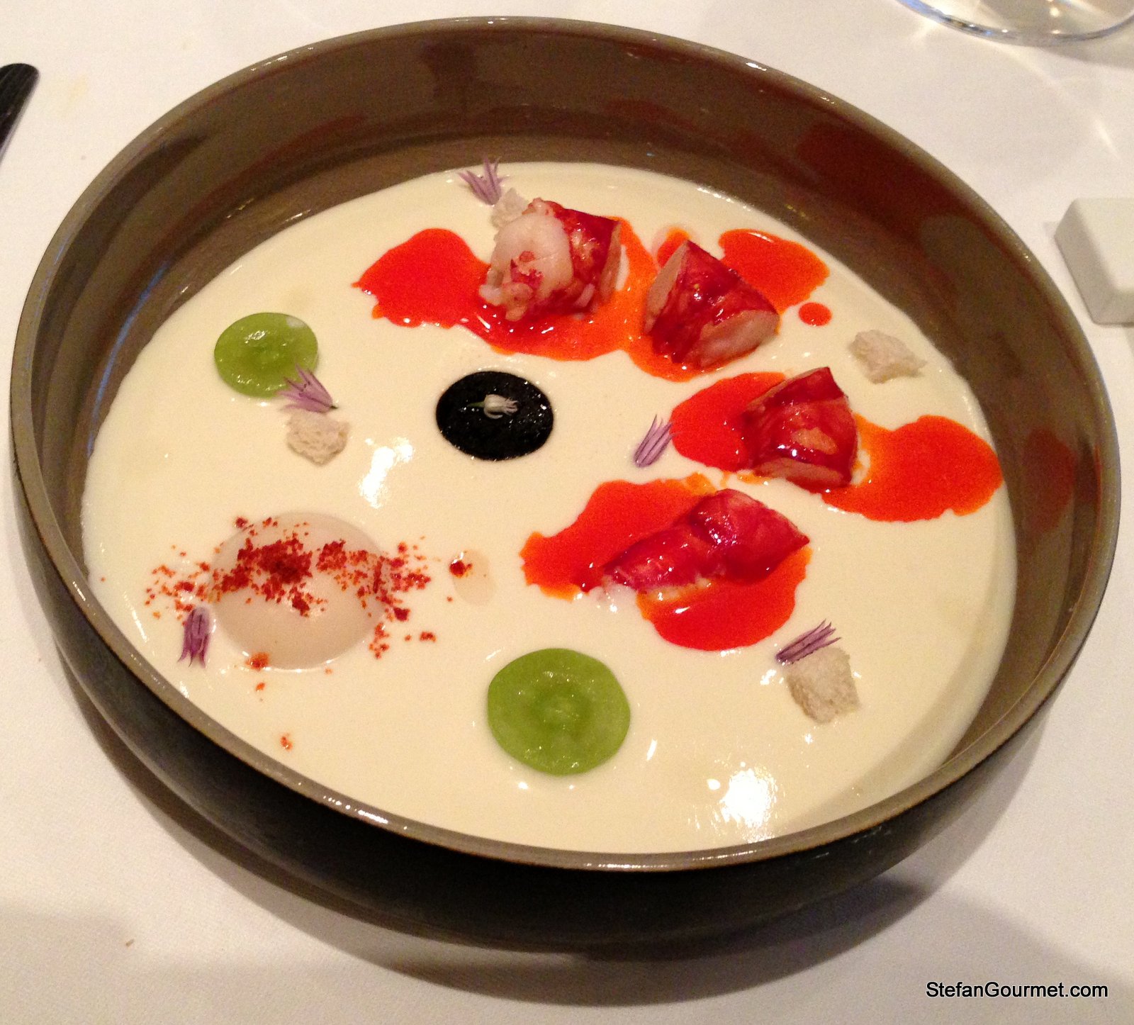 Spanish prawn with grapes, almonds, and ‘ajo blanco’. The Ajo blanco was a garlic soup that had a delicious very full garlic flavor without being too strong. The prawn was perfectly cooked and not overpowered by the ajo blanco. The dish was appropriately paired with a Spanish white with quite a bit of new oak. 9/10