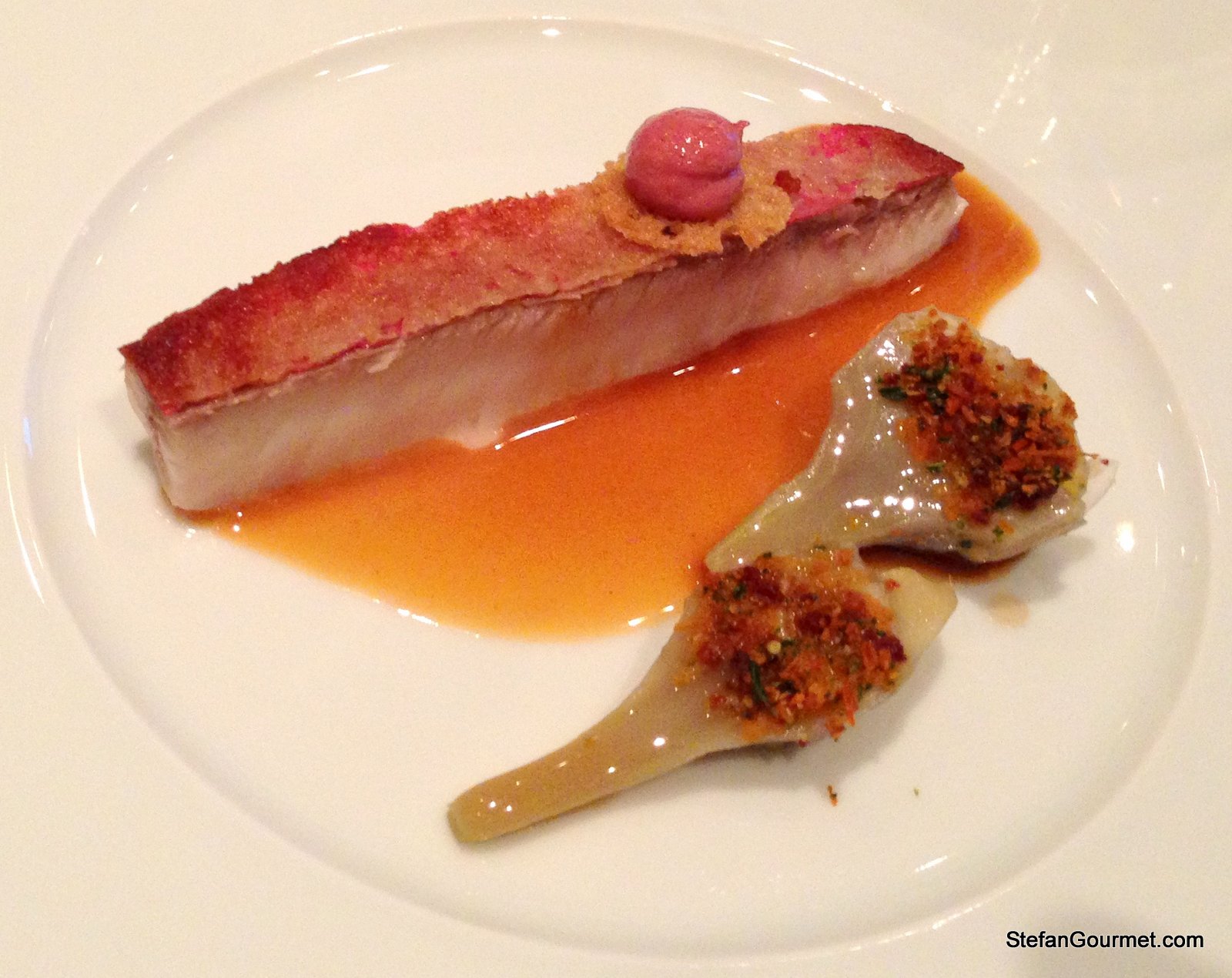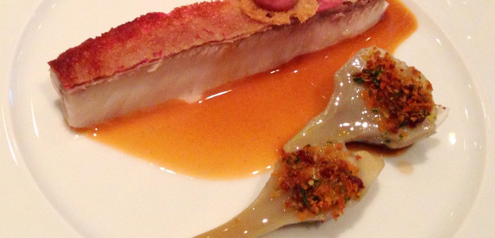 Red mullet with a ‘jus à Bécasse’, artichokes ‘à la barigouie’ with breadcrumbs. The mullet was perfectly cooked (probably sous-vide) with the mullet’s liver on top. The crispy skin had been cooked separtely. The mullet’s liver was also used to fortify the sauce. Great flavors and textures, paired with a St. Aubin that was perhaps a bit too oaky. 9/10
