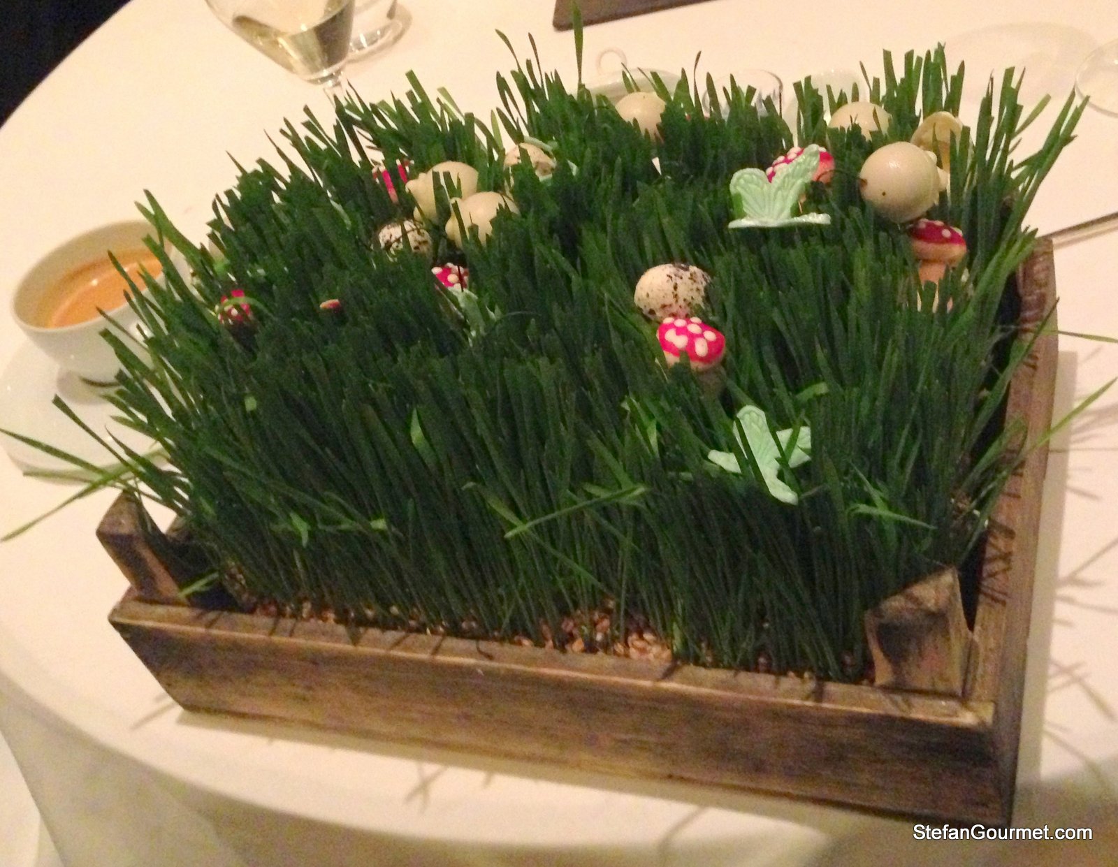 The sweets with the coffee were served on a bed of wheat grass. It looks nice, but the sweets were just that: sweet. This is the only time during the whole evening where form was more important than substance (i.e. flavor).