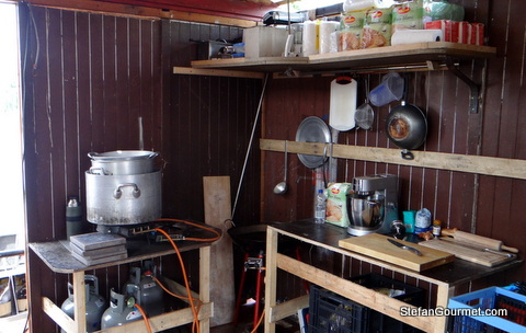 Of course I brought my sous-vide cooker, but you can’t see it here because it’s up on the shelf. For such a large group a large pot is needed. The paella pan in the corner is also very useful for pan frying.DSC07437