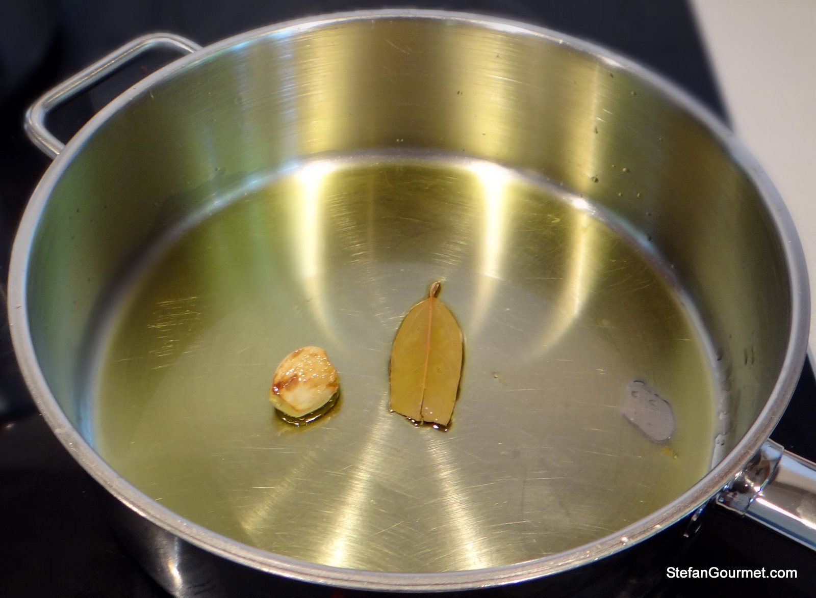 Heat the oil in a frying pan. Add the garlic and the bay leave, and sauté over medium low heat until the garlic is golden. Do not allow the garlic to burn.