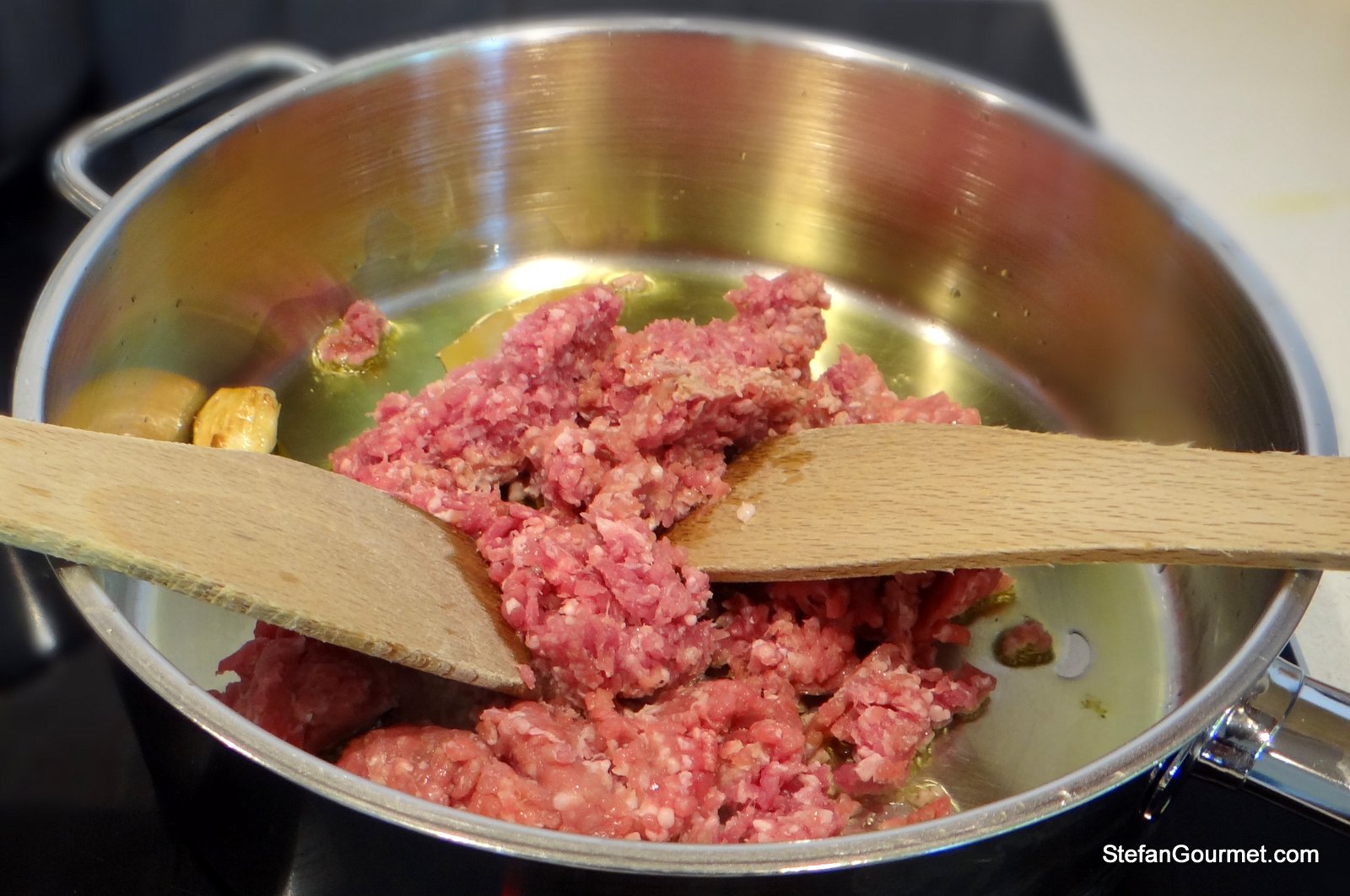 The ragù is done when the sauce has thickened and the lamb is tender (with minced lamb that’s not relevant), which takes about an hour to an hour and a half. Remove the garlic and the bay leaf at this point.