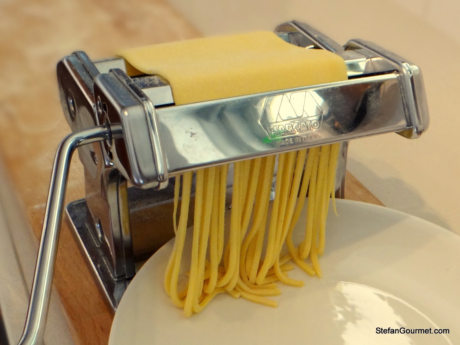 I don’t own such a device, but since I do own a tagliolini attachment for my pasta roller with a width of 2-3 mm, I figured I can cheat and prepare something very close to spaghetti alla guitarra using the attachment for tagliolini. To get square pasta, the thickness of the dough should also be 2-3 mm. Spaghetti alla chitarra should be served very much al dente, with a lot of bite to them, so it is important not to overcook them.