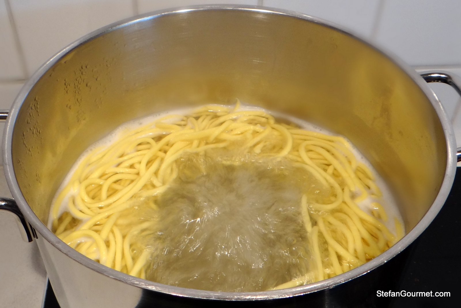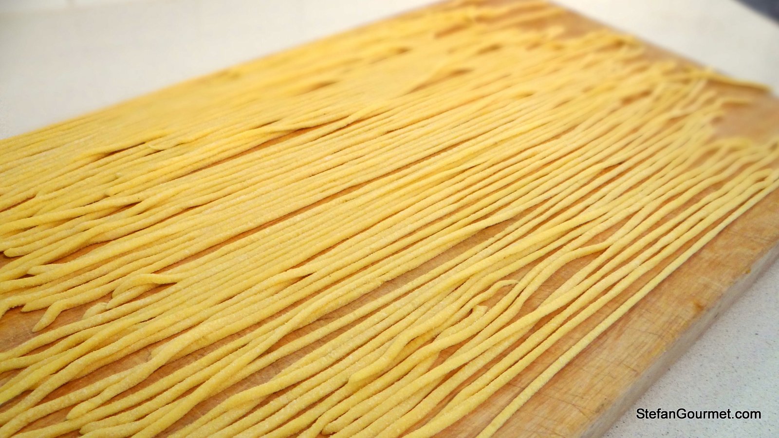 Prepare fresh pasta dough from the eggs and the flour, allow it to rest for half an hour in the fridge, and then roll it out to a thickness of 2 to 3 mm (1/12 to 1/8 inch) and cut it into noodles with a width of 2 to 3 mm as well. By all means use a chitarra device if you own one 🙂