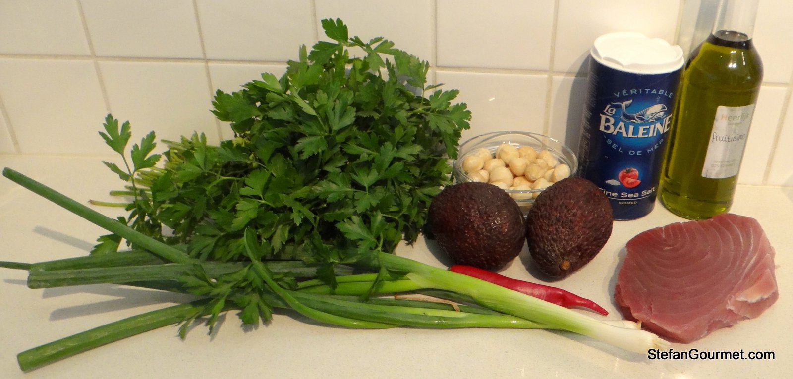 Poke is a Hawaiian dish made with raw tuna (called ahi in Hawaii, either big eye tuna or yellowfin tuna) and a variety of other ingredients. I based my first attempt upon Richard’s post about Pesto Poke, but I added some avocado as well and replaced the cilantro with parsley.