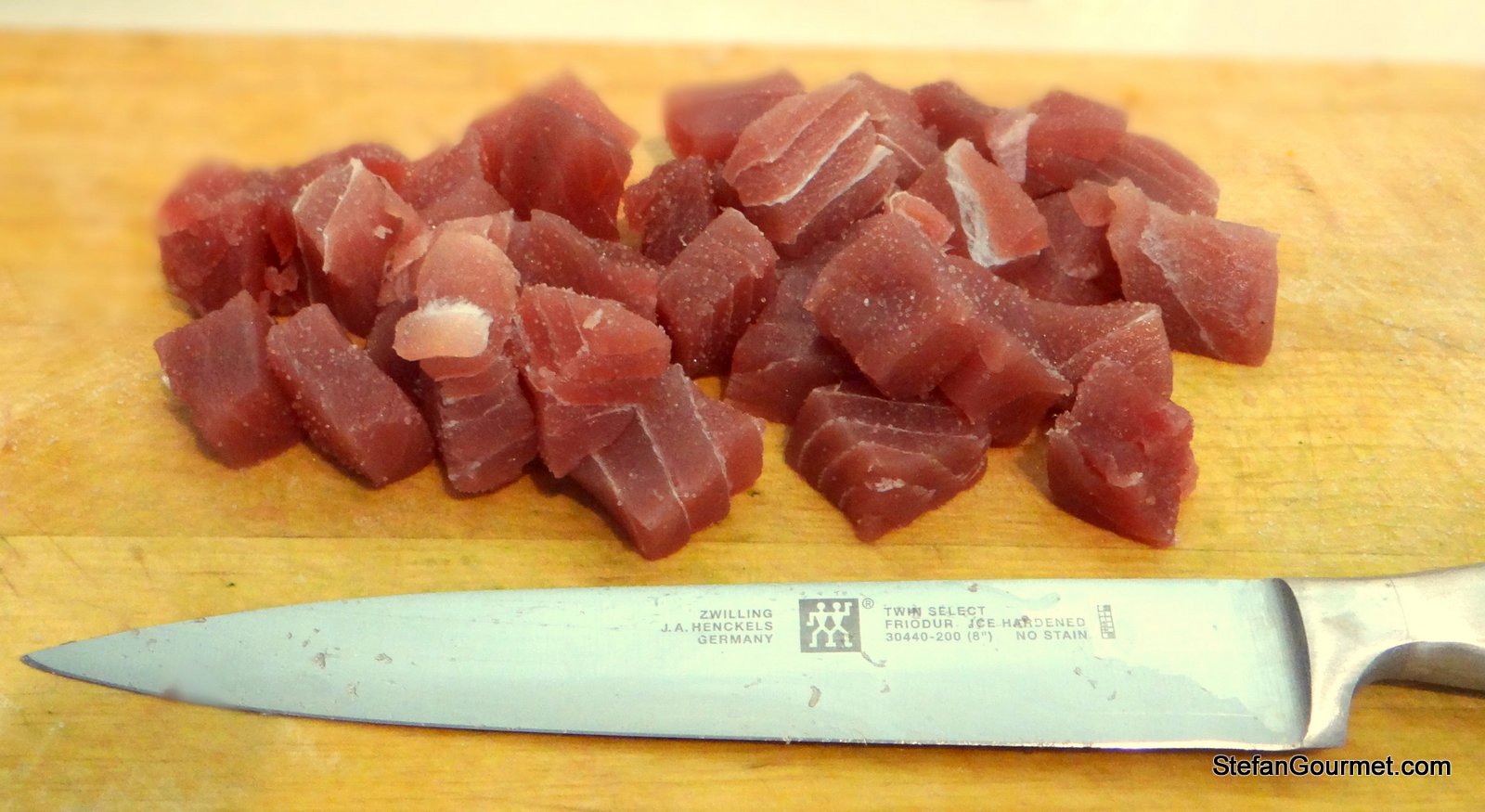 Cut the tuna into 1.5 cm (3/4″) dice. Season with salt.