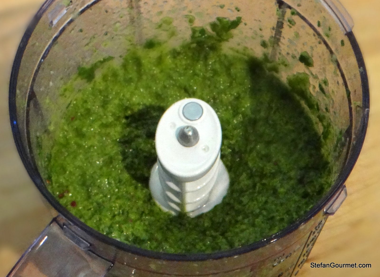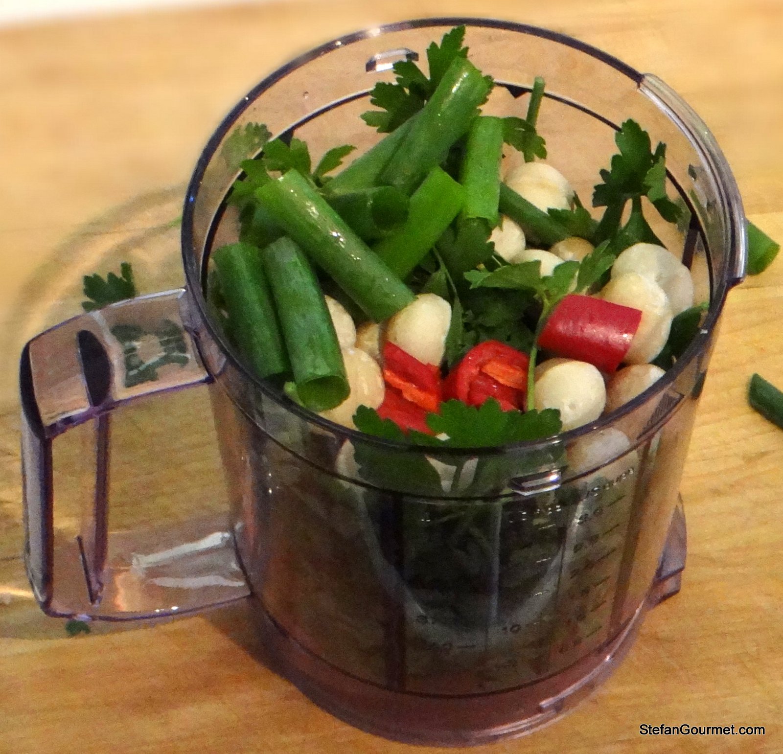 Combine the parsley, green onions, chile pepper, macademi nuts, and ginger in the blender. Add some salt as well.