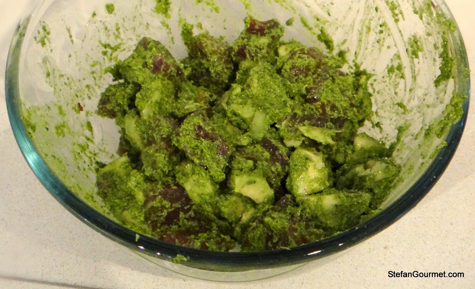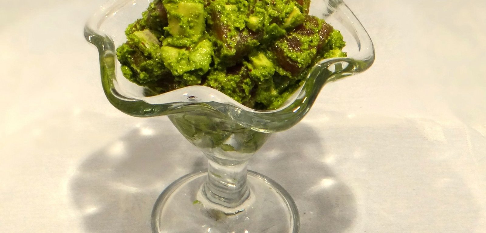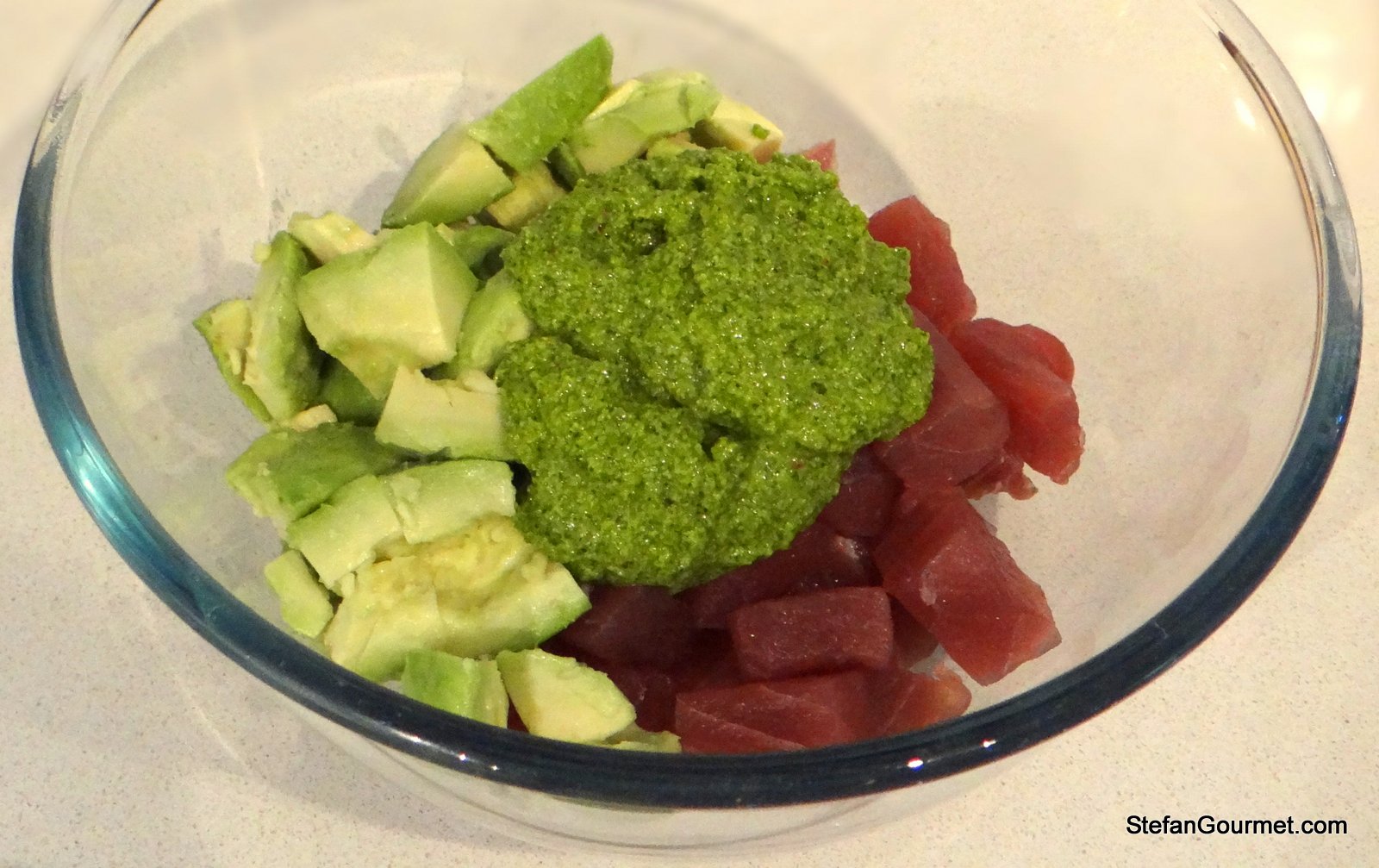 Remove the seed from the avocados and peel them. Cut the avocado into similar dice as the tuna. Combine the tuna, avocado, and pesto in a bowl.