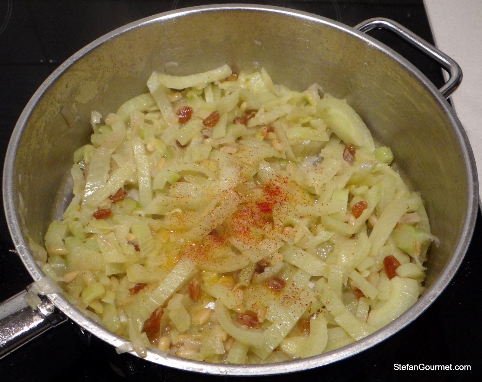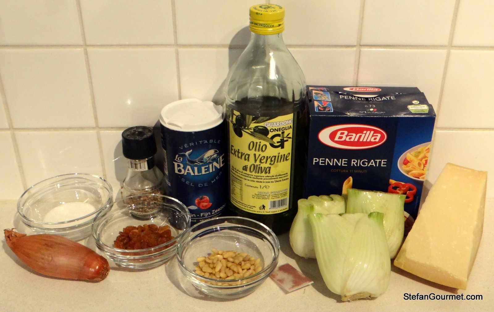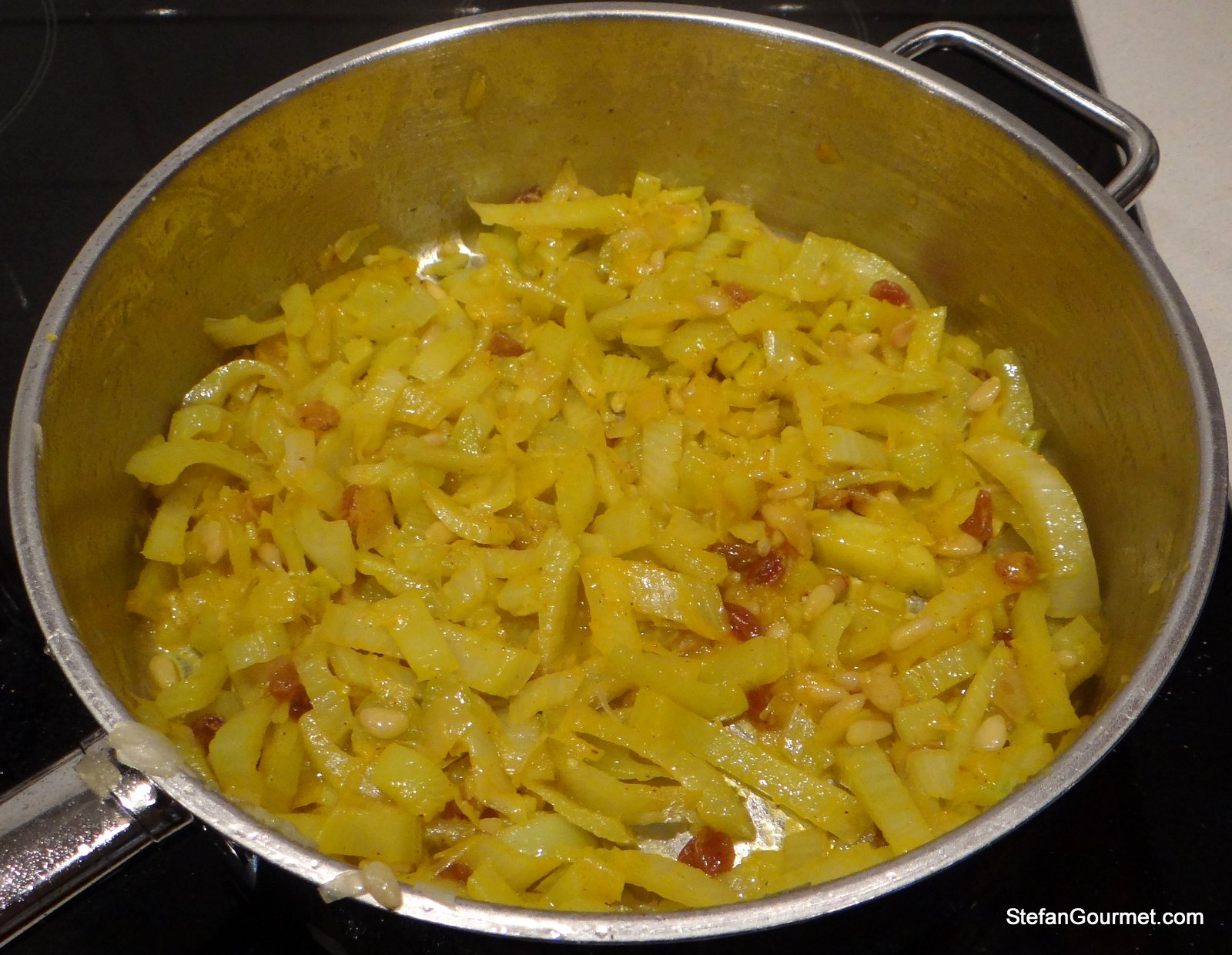 I had fennel left over after making fennel polpette using only the greens. I decided to use the fennel to make a Sicily-inspired pasta dish with raisins, pine nuts, and saffron. When I made this for the first time, I thought it was a bit bland. Now I added sugar and parmigiano and the result is very tasty. The flavors of the raisins, saffron, and fennel work together very well and are supported by the pine nuts and parmigiano. This is a nice vegetarian pasta dish that I will make again. I am not sure if it resembles any traditional Sicilian pasta dish.