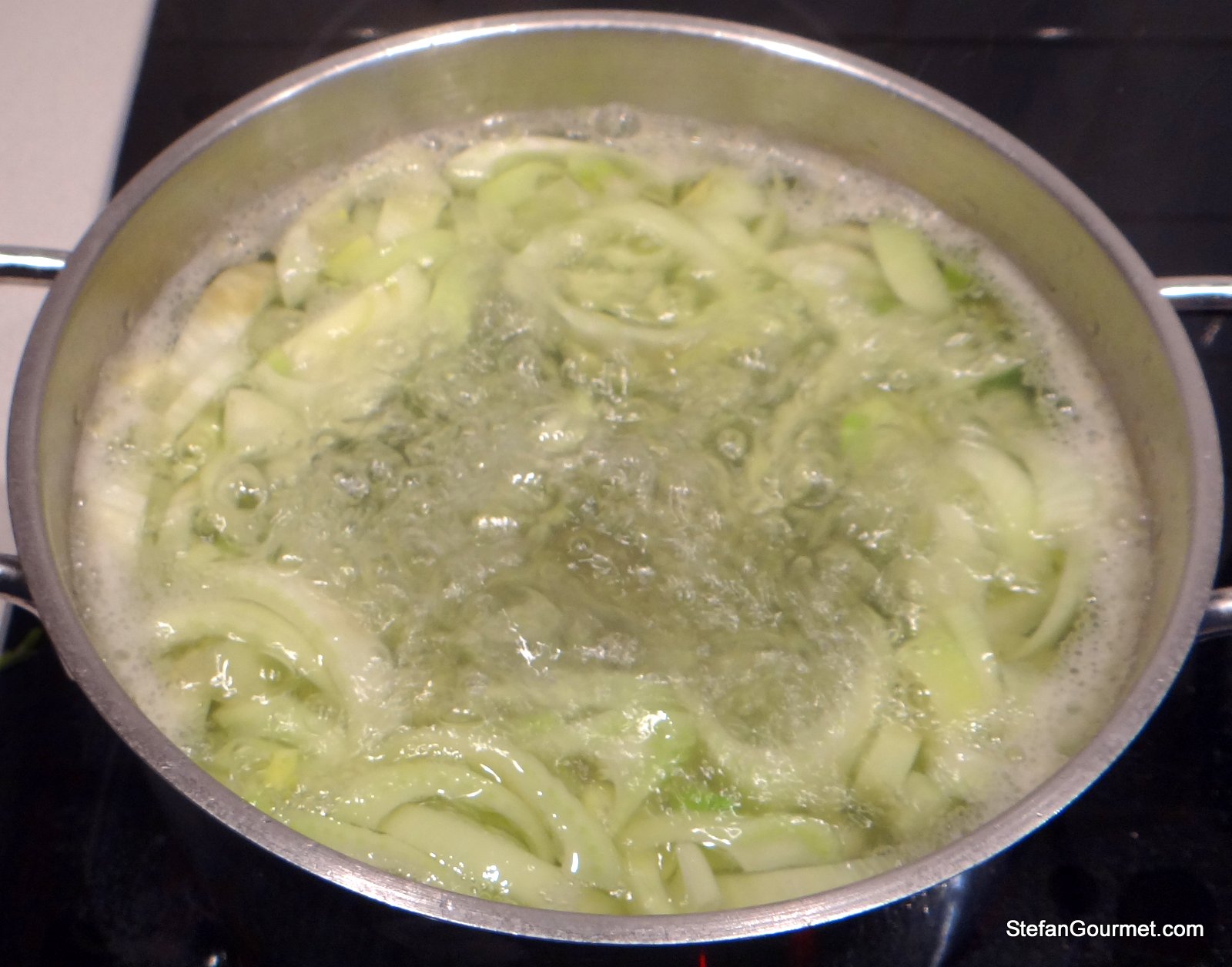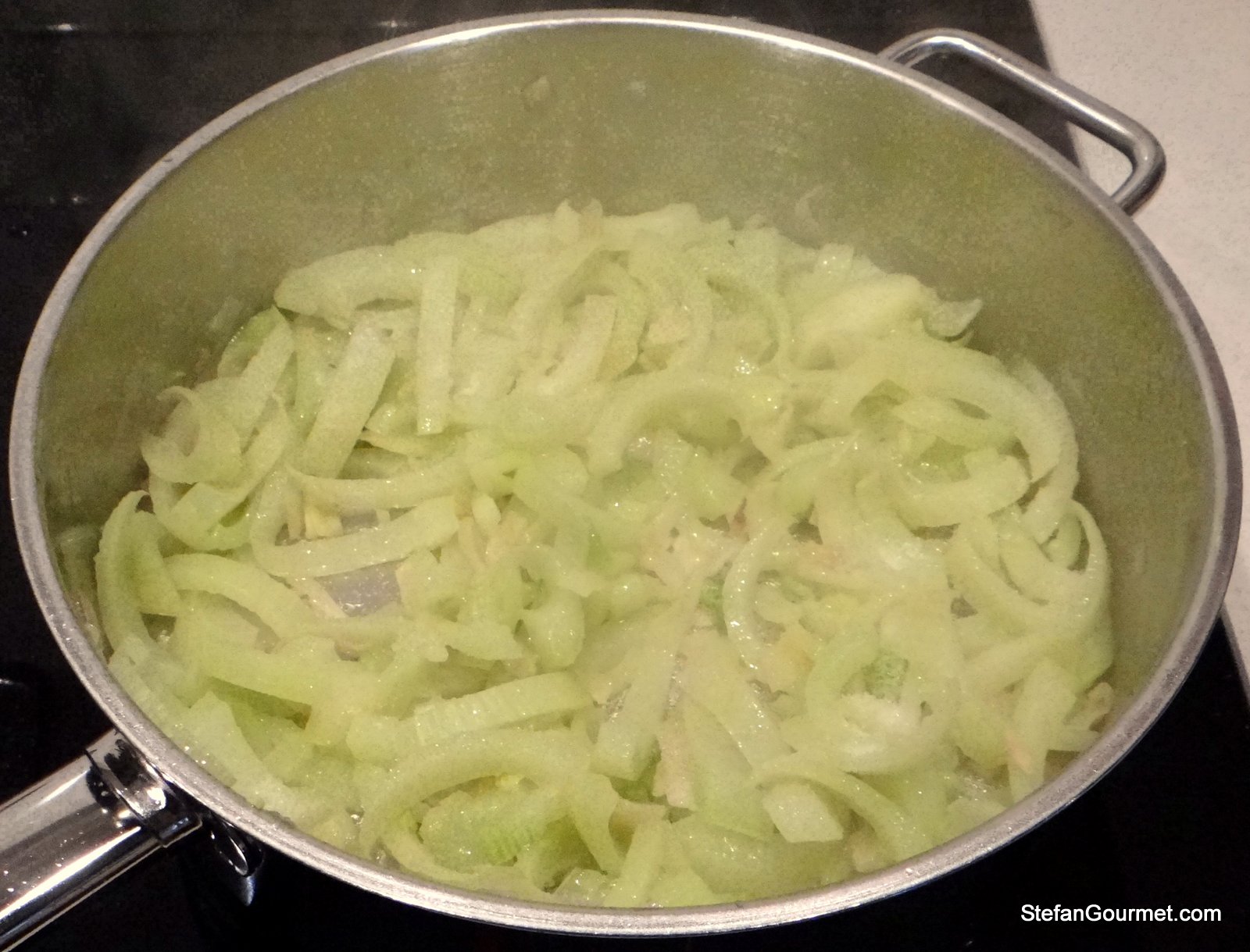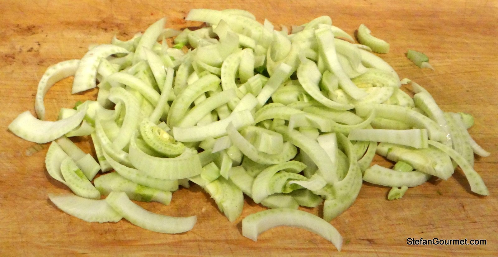 Bring a pot of water to a boil. Meanwhile, cut the bottom and the greens off the fennel bulbs, cut them in halves vertically, and slice them into 1 cm (1/2″) slices.