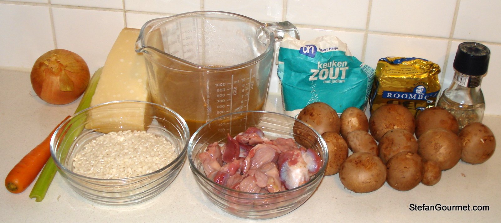 John did not only share the recipe with us, but also a funny anecdote about his mother having to disguise the chicken gizzards as mushrooms so his sibling would eat the risotto. I can imagine that if you see the gizzards you may have the same reaction as John’s sibling. It is part of the reason why this was the first time I used them. Just like other meat, a gizzard is a muscle, which in this case is used by the chicken to grind its food like we use our molars. In this sense the gizzard is more akin to a chicken thigh then it is to a chicken liver. (In Holland chicken gizzards are called “chicken stomachs”.) Because gizzards are used a lot throughout the chicken’s life, the gizzards are a tough but flavorful piece of meat. The toughness can be fixed by braising or stewing them, and that is exactly what happens in this recipe.