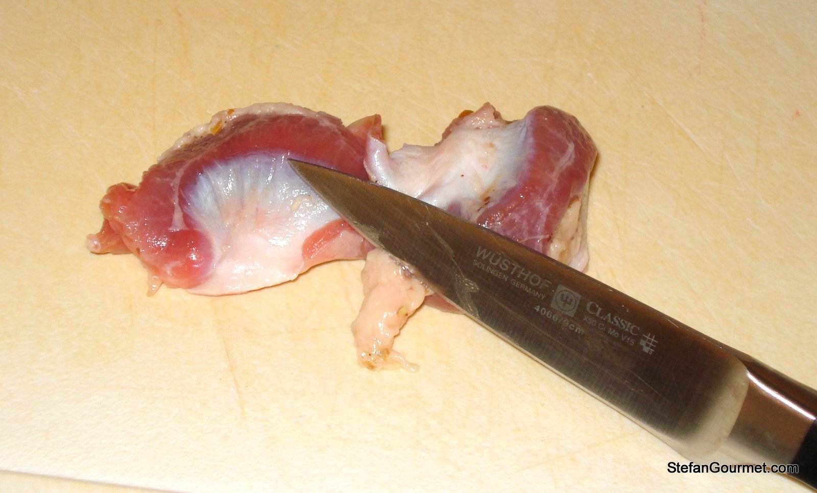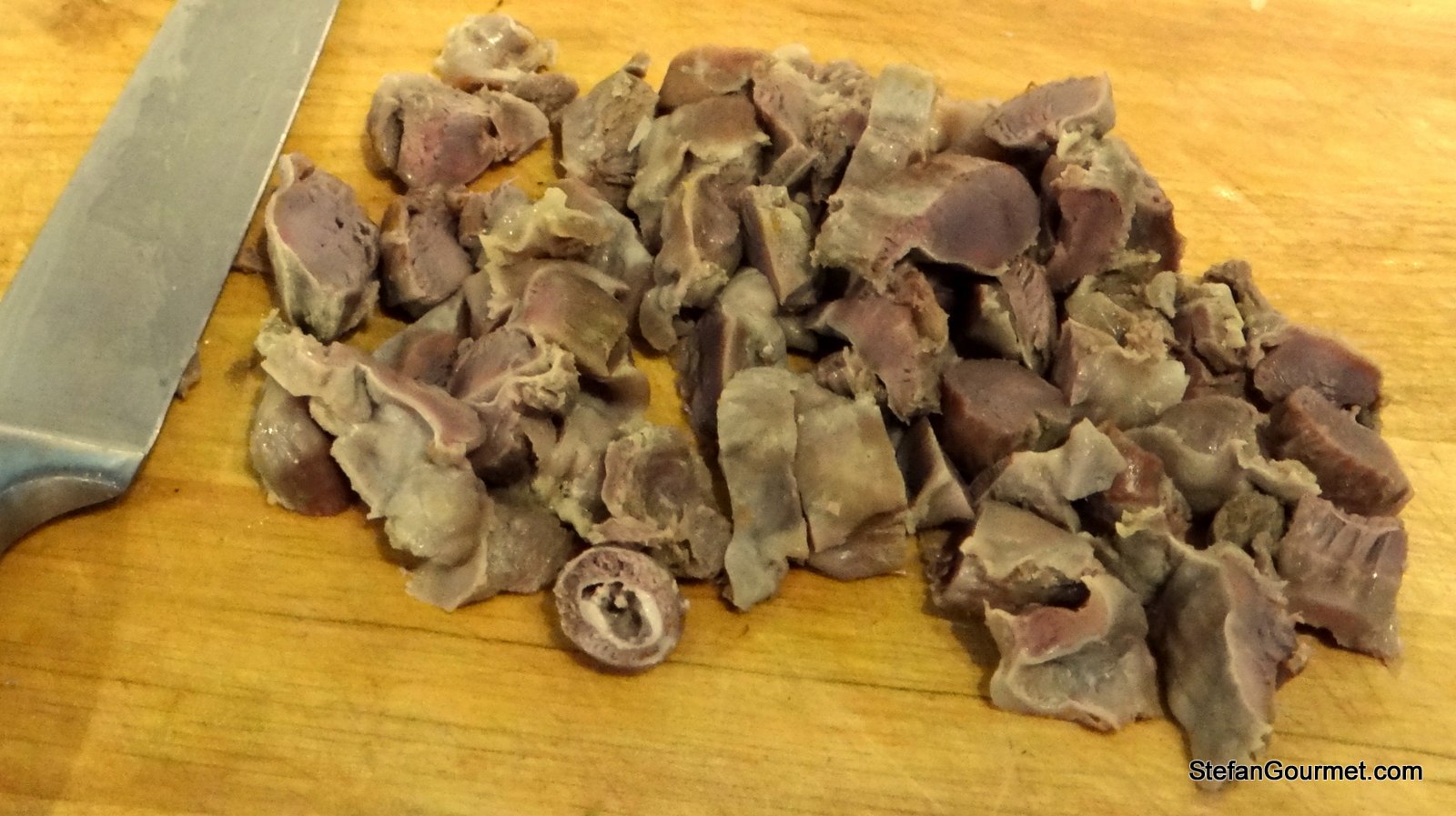 Slice the chicken gizzards into 5 mm (1/4″) slices once they have cooled a bit.