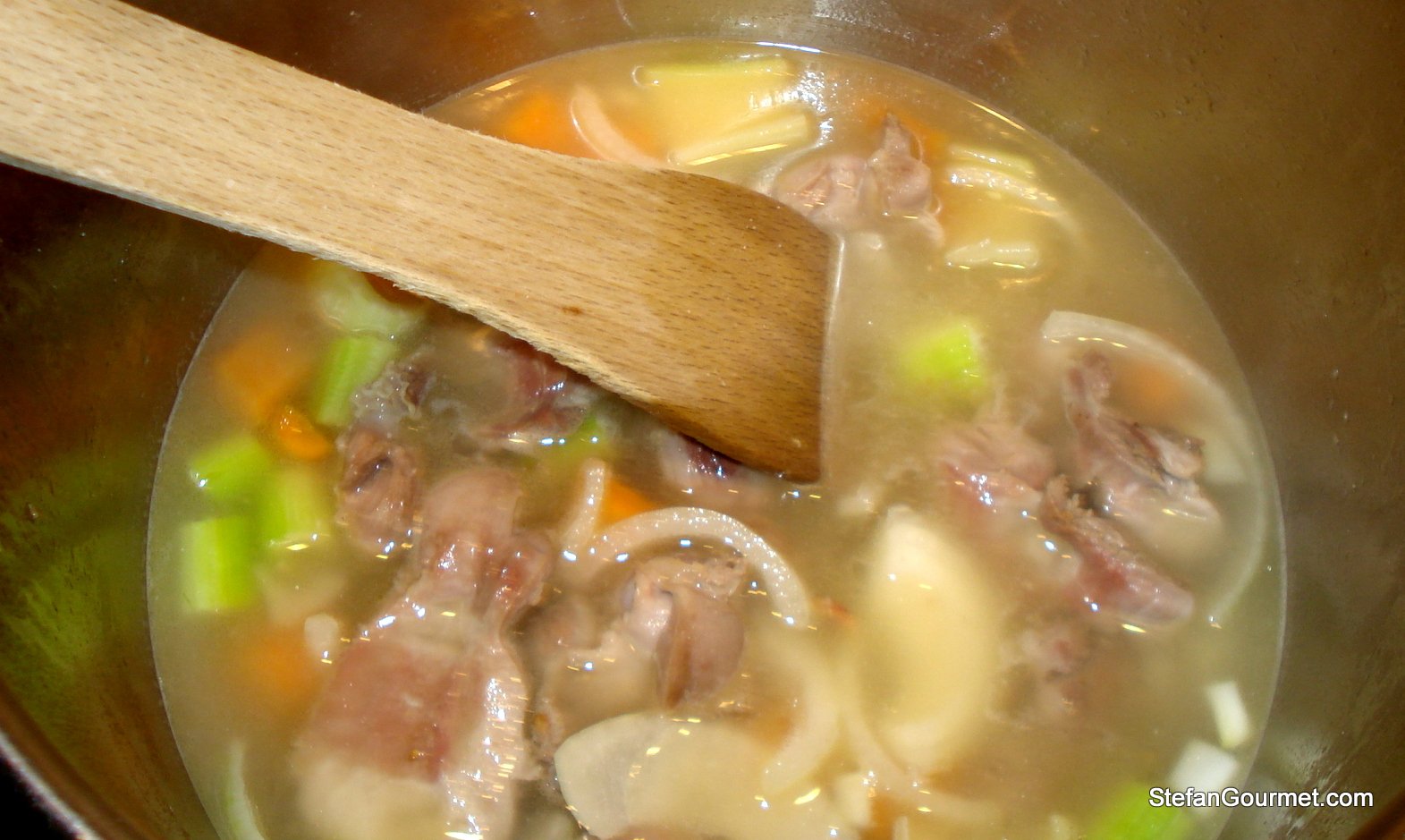 Turn the heat to high and bring to a boil, scraping the bottom with a wooden spatula to include all of the nice browned bits into the stock.