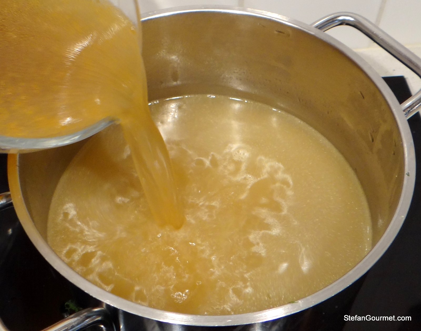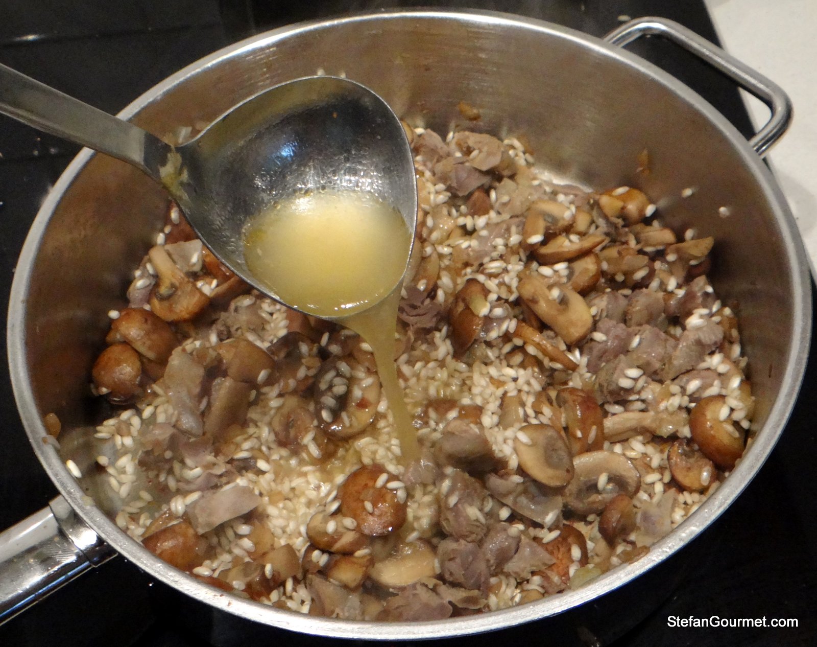 You will have about 400 ml (1 2/3 cup) of gizzard stock. Add chicken stock to obtain about 700 ml (3 cups) of stock to use for the risotto. Keep the stock hot.