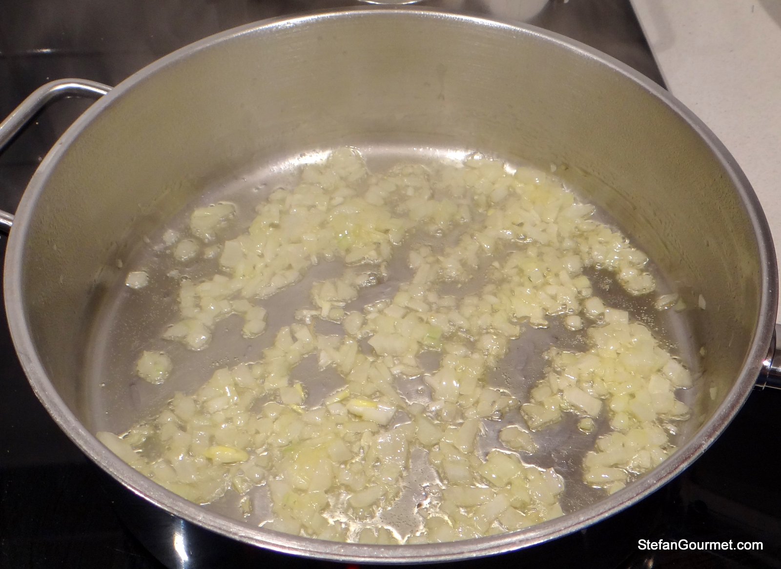 Heat 2 Tbsp butter in a wide thick-bottomed pan and add the minced onion. Sauté over medium heat for a few minutes until the onion becomes translucent.