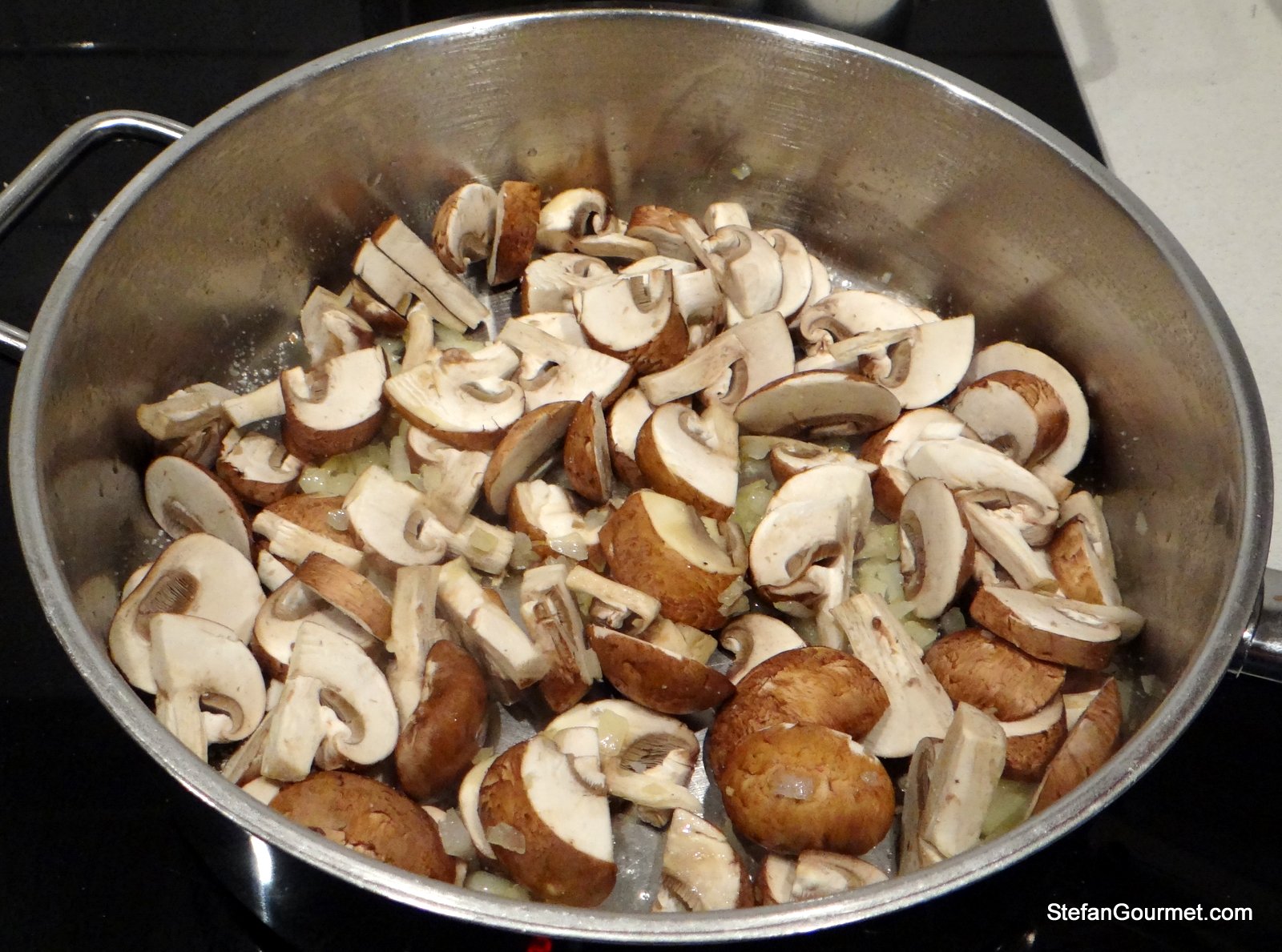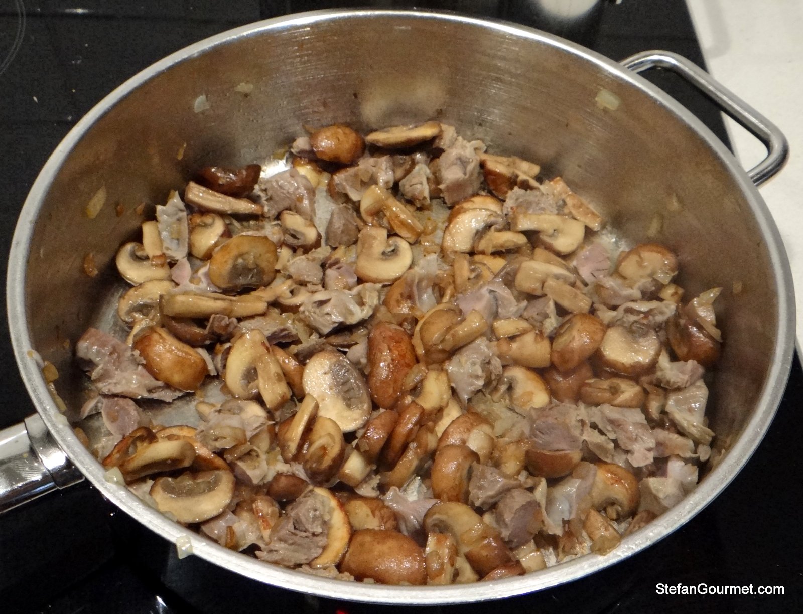Sauté the mushrooms until they are nicely browned. Then add the chicken gizzards, season with salt and freshly ground black pepper, and stir for a minute until the gizzards have been warmed through.