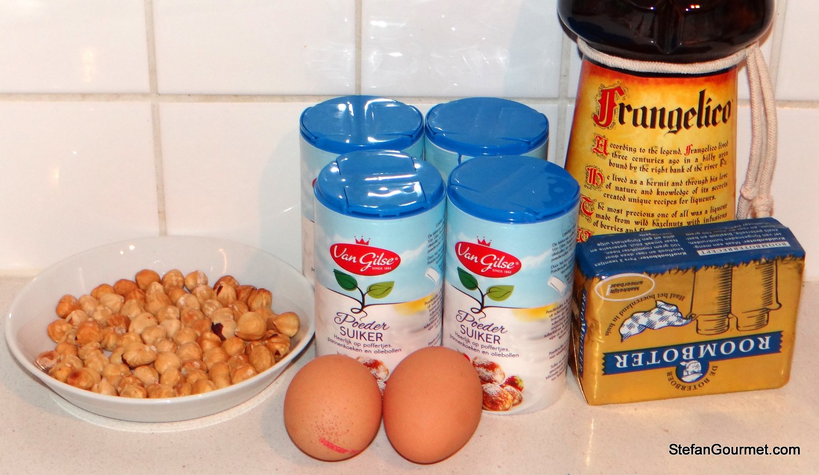 This cake is relatively easy to make and can be presented as a neat layer cake or, as I chose to do in this case, in a more ‘artistic’ way. Kees hates regular meringue, but he loves hazelnut meringue. Traditionally, hazelnut meringue cake is made with a complicated butter cream. The butter cream in this recipe may be slightly less creamy, but it is a lot easier to make and very good all the same. Hazelnut meringe cakes are often coffee-flavored as well, but I decided to use hazelnut liqueur to flavor the butter cream instead.