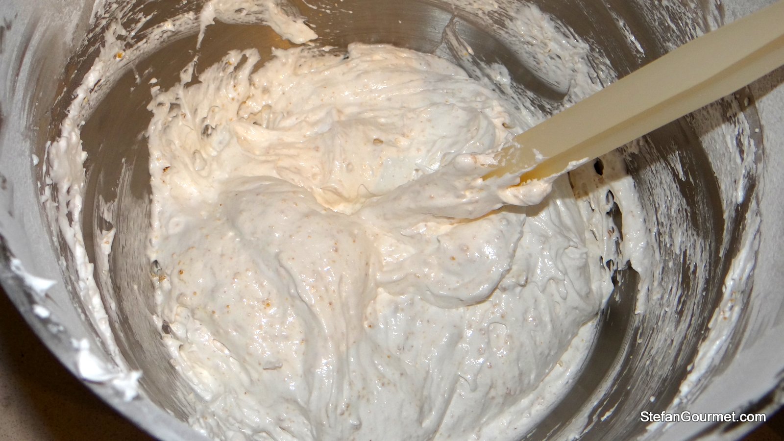 Fold the hazelnut powder into the egg whites using a rubber spatula, making slow movements from below.