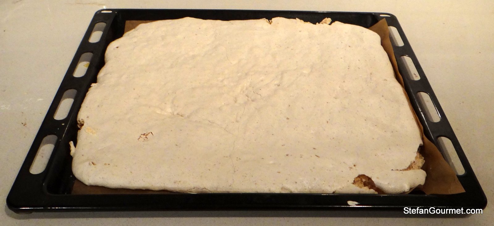 Line a baking sheet with parchment paper. Spread out the egg white mixture on the baking sheet, and bake for 90 minutes at 130C/265F.
