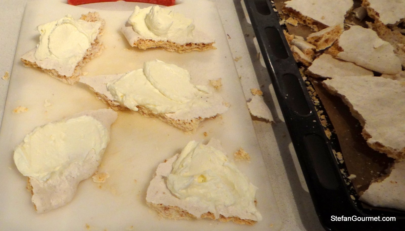 Break the meringue into chunks. Arrange the chunks on a serving tray and put a dollop of butter cream on top of each chunk.