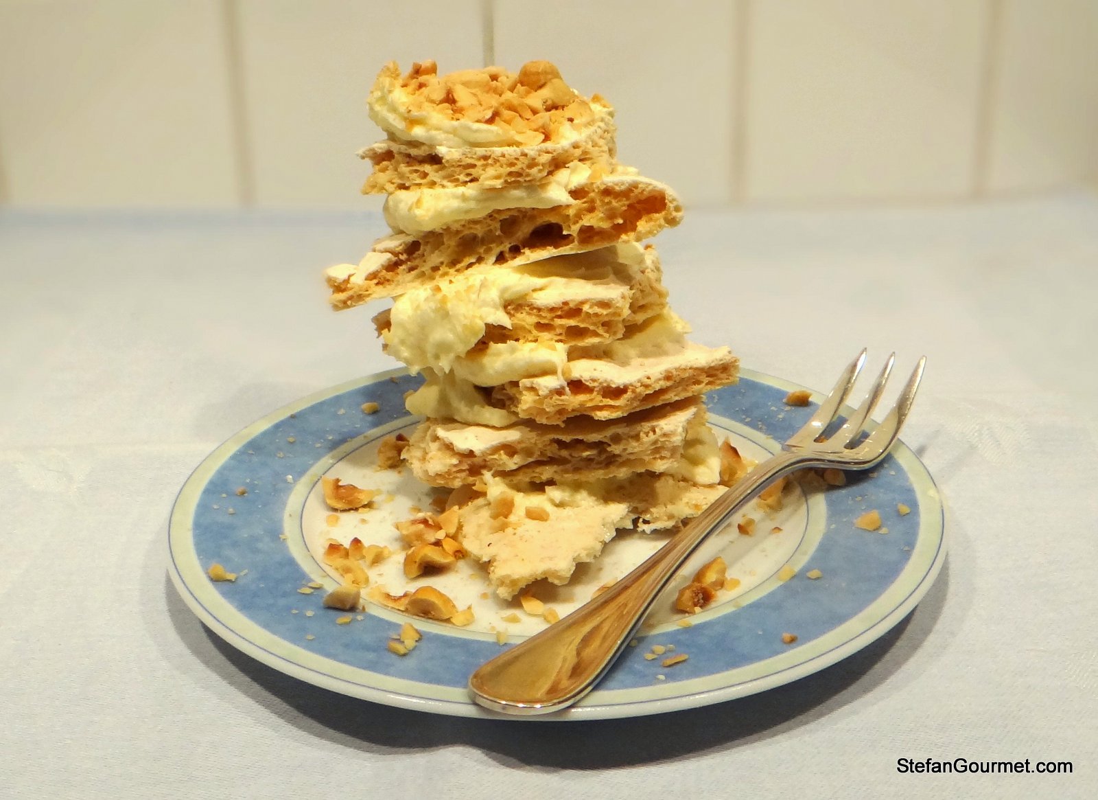 Add more layers of hazelnut meringue and butter cream to your liking. Finish with butter cream and then sprinkle with the coarsely chopped hazelnuts. Allow to chill in the refrigerator for at least a few hours.