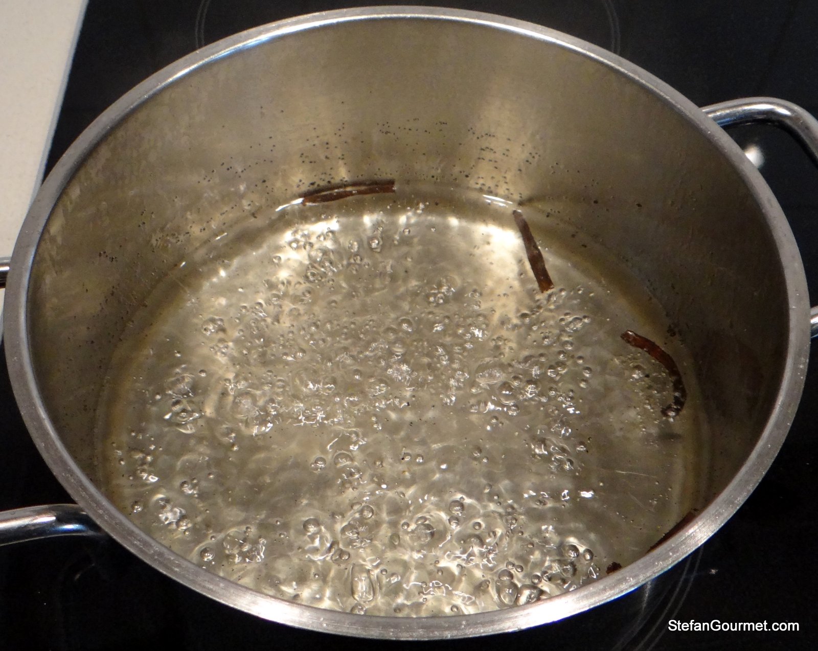 Prepare vanilla syrup by combining water, sugar, and vanilla pod in a saucepan and bringing this to a boil. Allow to boil for 1 minute.