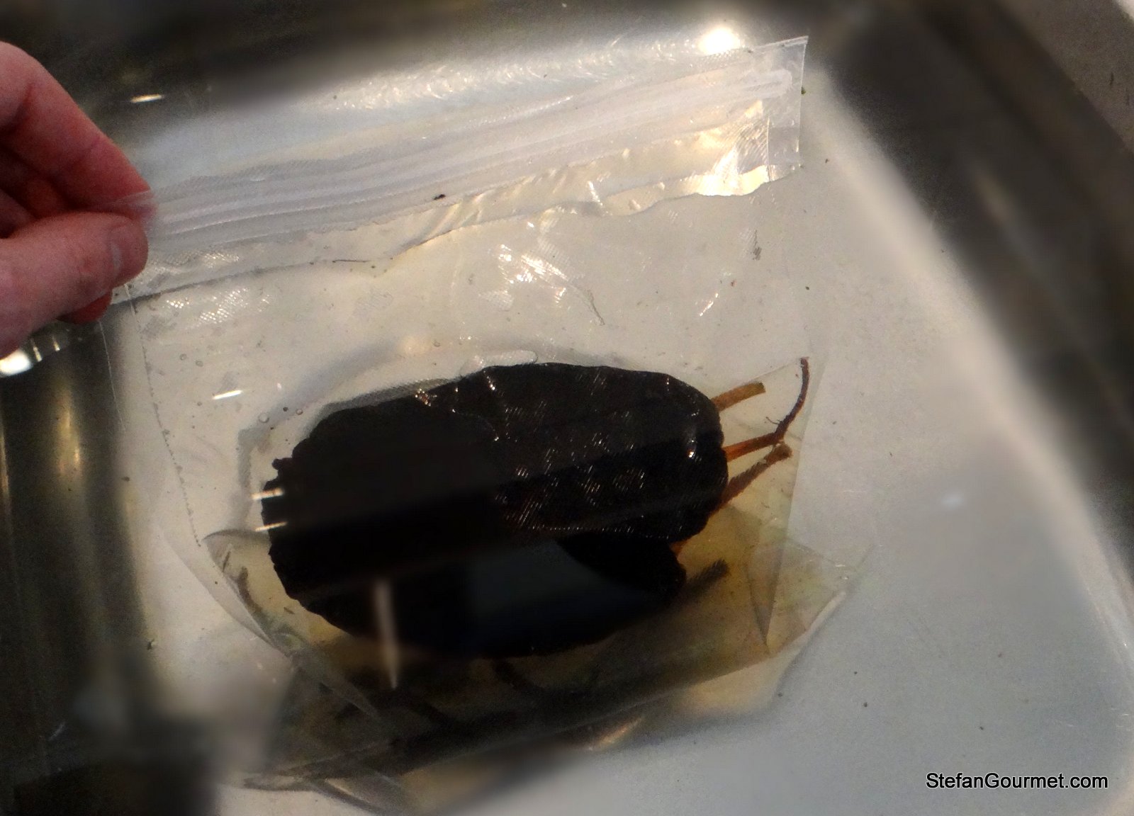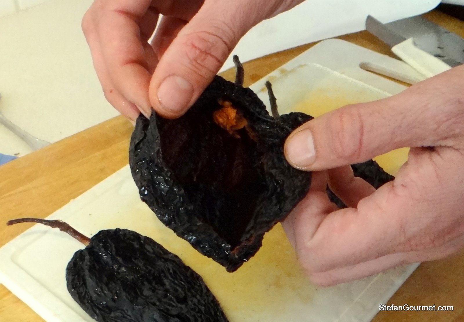 Take the chiles out of the ziploc bag (discard the syrup), pat them dry with paper towels, make an incision and carefully remove the seeds and ribs. Leave the stems on. (You can also do this step before soaking the chiles, but this way the chiles are more supple and thus less likely to break.)