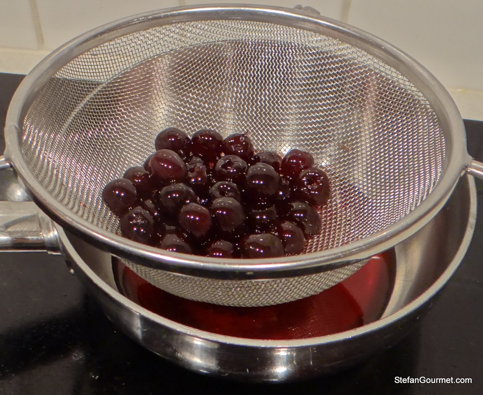 Drain the cherries, catching the syrup.