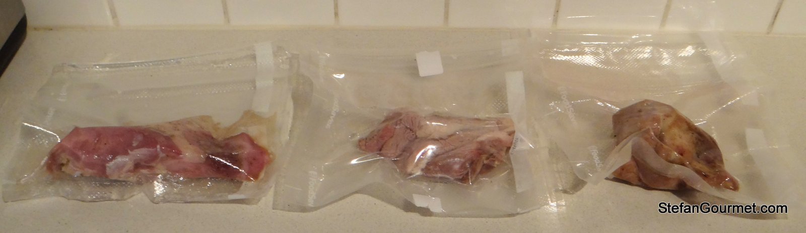 I vacuum sealed all three pieces separately. From left to right: raw, scalded, seared.