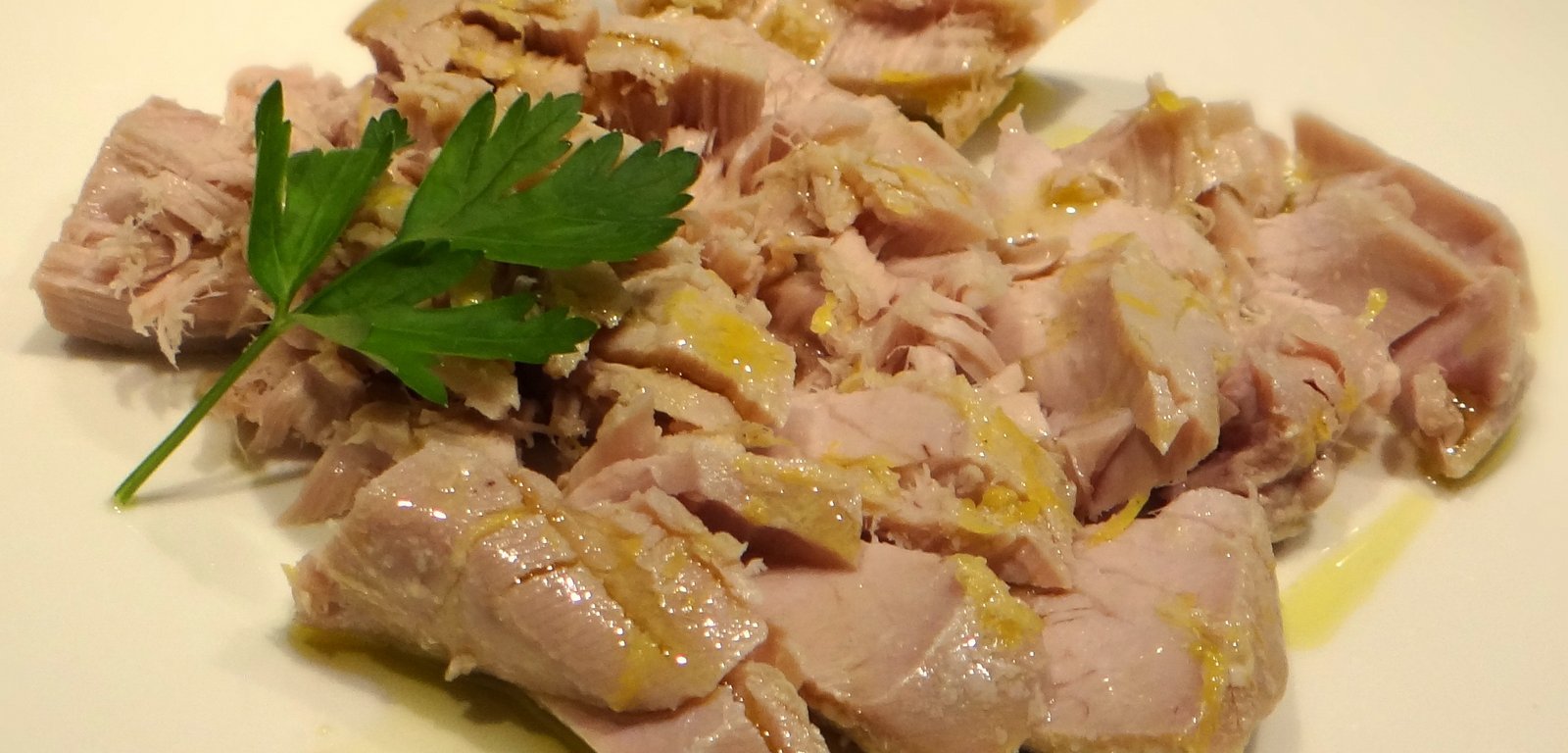 Canned tuna is cheap, but often of inferior quality. The tuna is dry and tastes mostly of salt. I have found good quality ‘organic’ canned tuna from the Ortiz brand, but that is more expensive than sashimi grade fresh tuna. So when I read about tuna cooked sous-vide with olive oil at 71ºC/160ºF for an hour as a tasty alternative for canned tuna on SVKitchen.com, my interest was piqued and I decided to give this a try. As the tuna will be pasteurized with this cooking time and temperature, it is perfectly fine to use frozen tuna for this that is a lot cheaper than sushi grade fresh tuna.