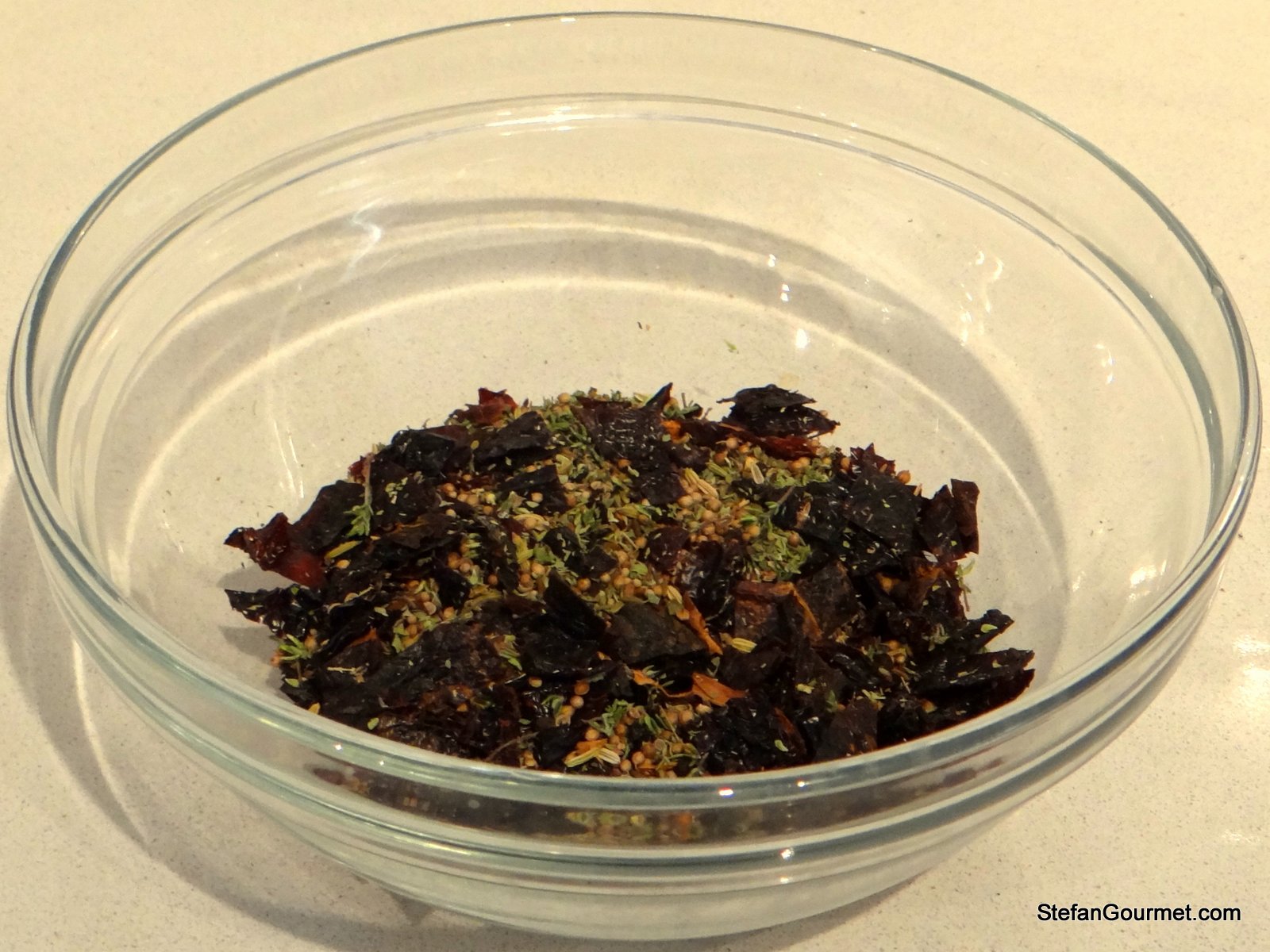 …and mix. Store in an airtight container in a cool and dark place. According to Richard it has a shelf life of 2-3 months. I don’t think it will last that long. I found it easiest to apply the mixture by mixing it with olive oil and then rubbing it on the meat or fish before grilling it.