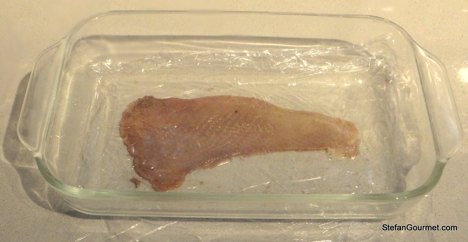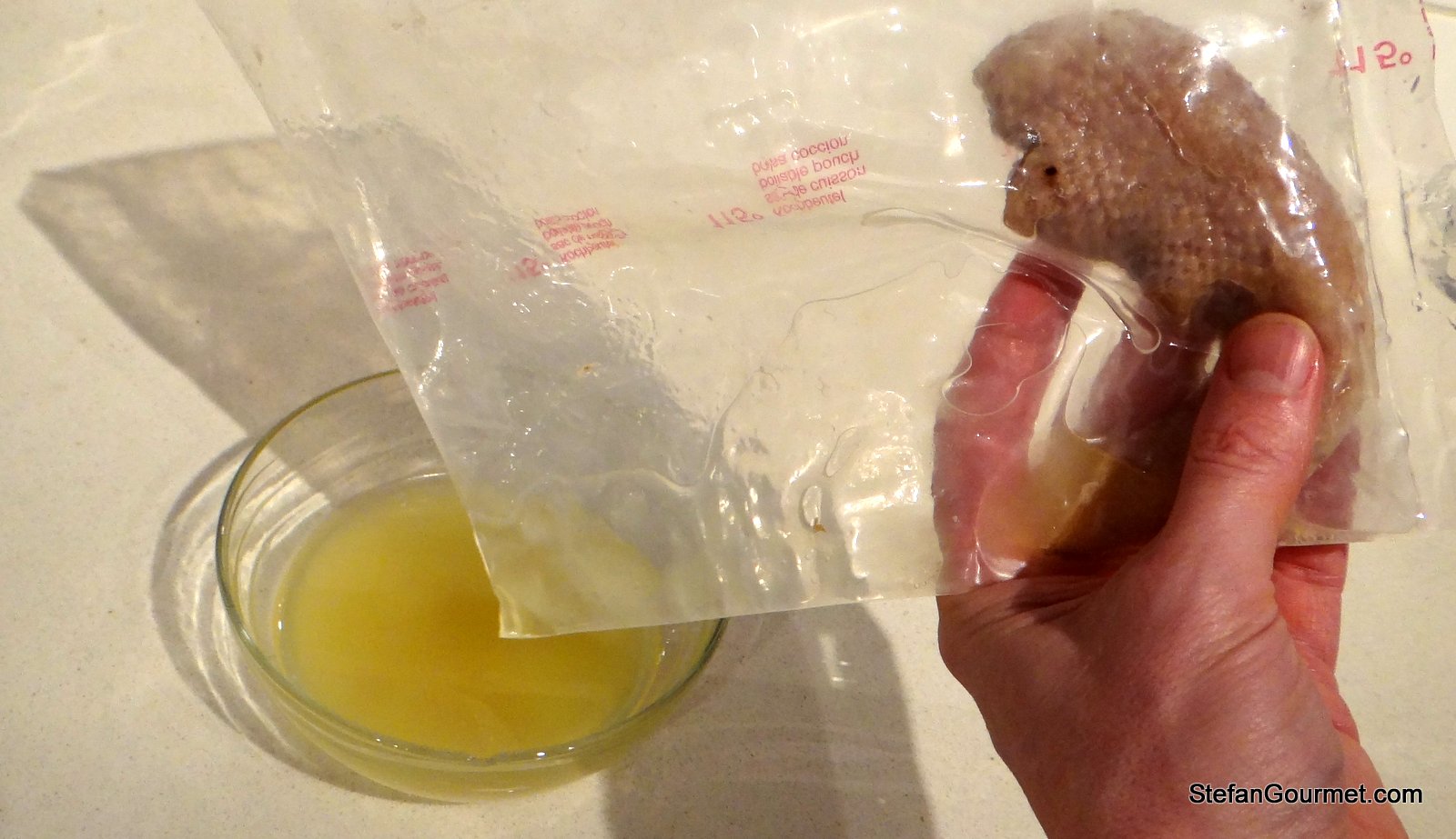 Now there is more to this dish than just the use of duck stock to make a demi glace (which in the modern form is just duck stock reduced until it is thick and syrupy and loaded with duck flavor). You see, I took a bit of a risk when I cooked the duck breast and duck skin separately and glued them together with Activa, and then called this ‘Perfect’ duck breast. Grant from An American Baker in London left a comment saying that he had seen something similar on Masterchef, but with the duck skin cooked sous-vide rather than in the oven to render the fat out of it before gluing it to the duck breast. The advantage of cooking the duck skin sous-vide would be avoiding shrinkage. Cooking the skin sous-vide sounded like music to my ears, and I quickly forgot that my previous version was perhaps not as perfect as I had thought it was.