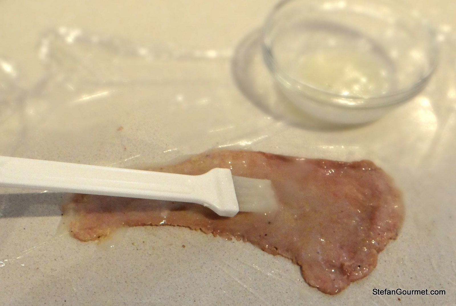 I made a mixture of 10 grams Activa with 40 grams water, and brushed it on the back side of the duck skin.