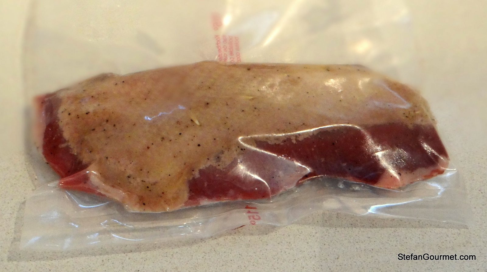 I vacuum sealed the duck breast with the skin on the bottom (so the weight of the duck would keep the skin in place) and some fresh thyme for additional flavor.
