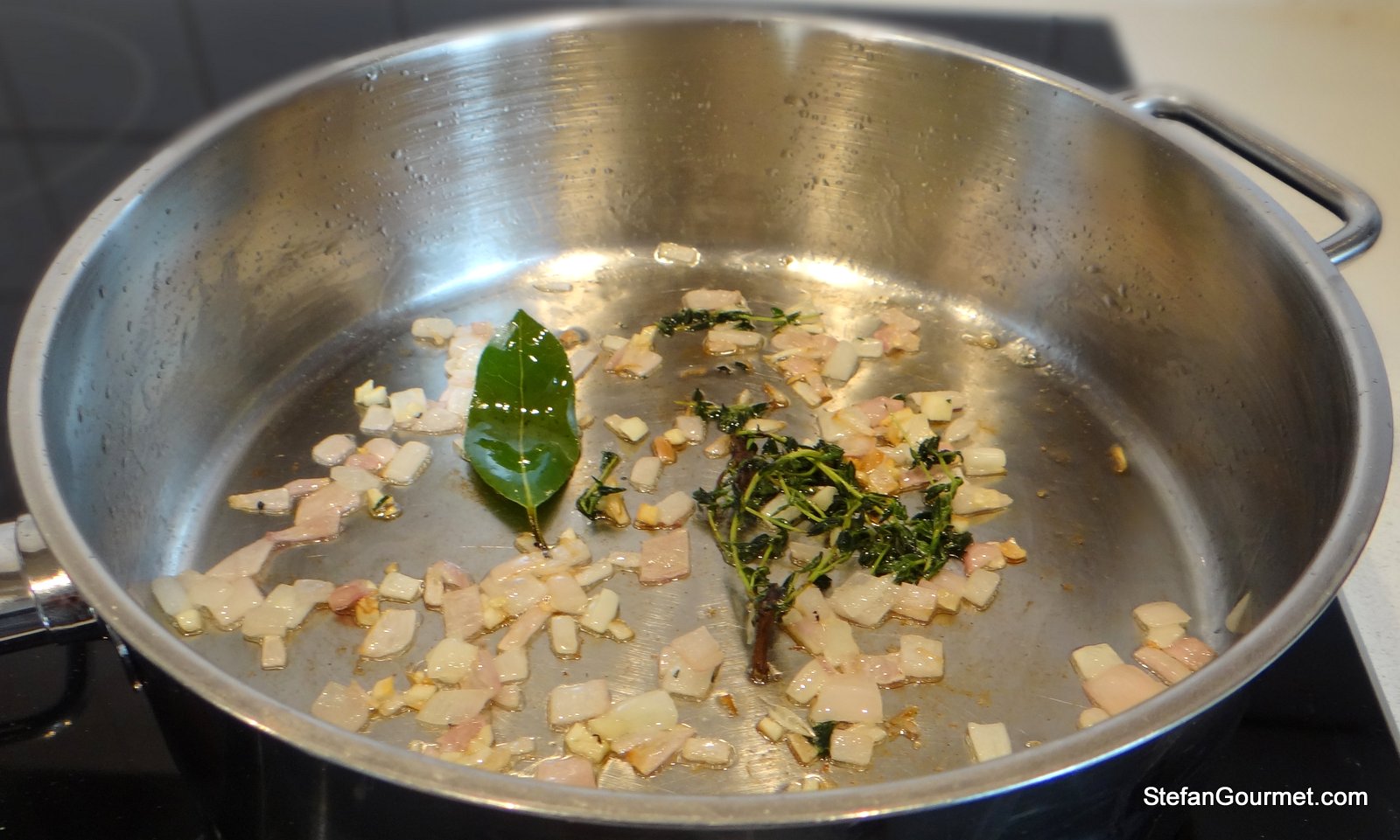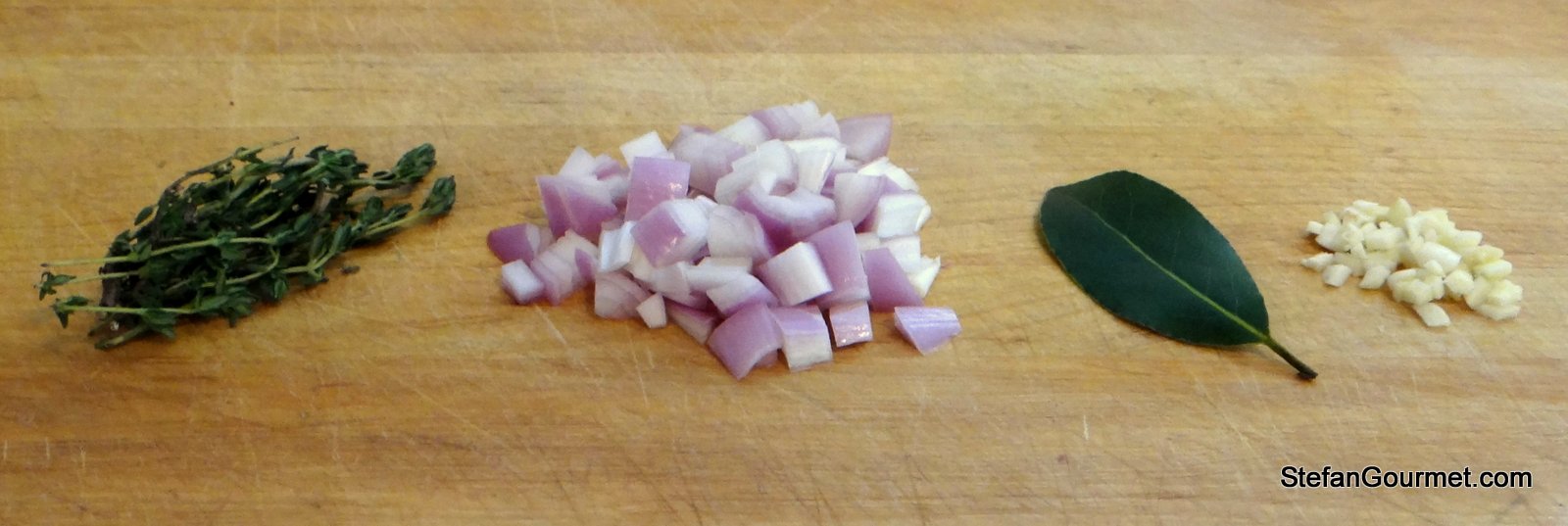 Then I added the shallot, garlic, bay leaf, and thyme, and sautéed this until the shallot was translucent.