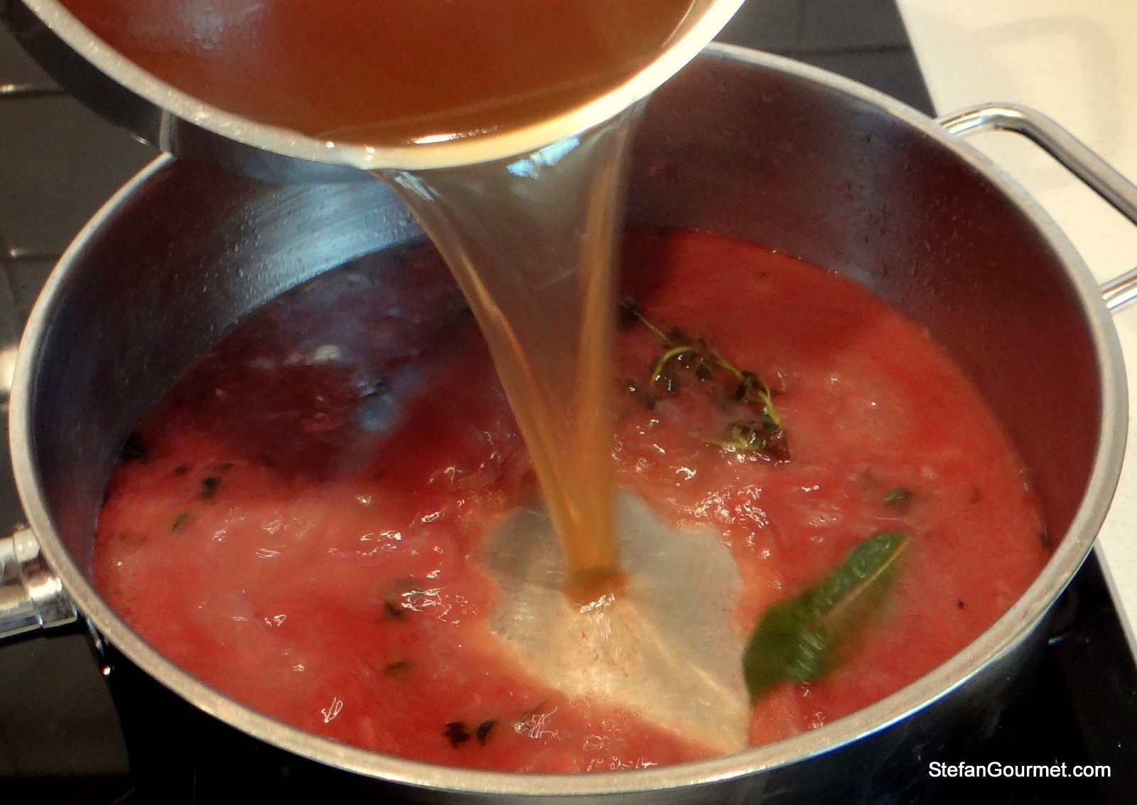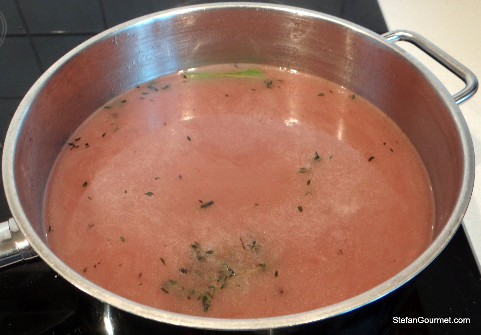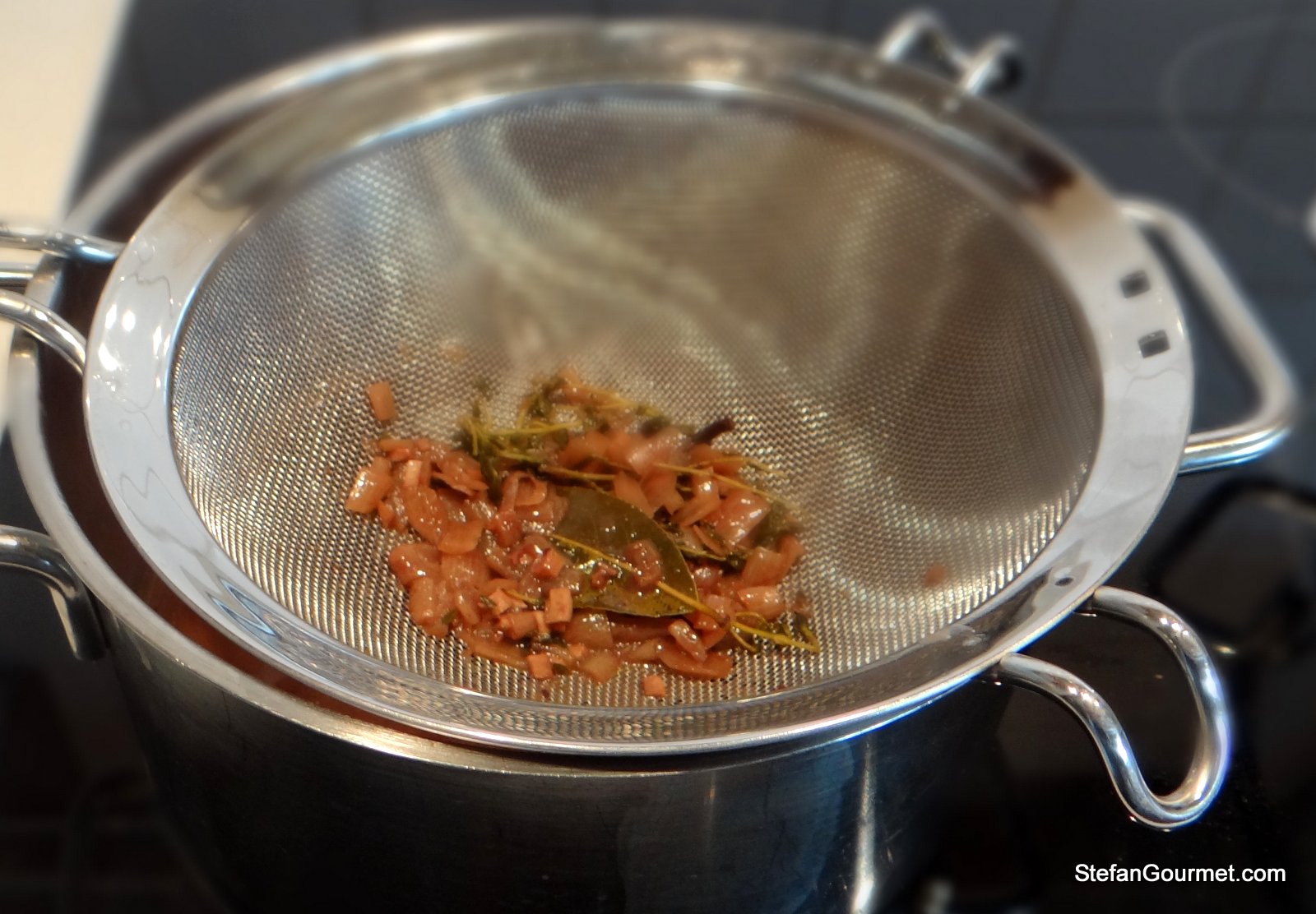 Then it was time to filter out the solids. (If you reduce it too much before filtering out the solids, too much of your precious demi-glace will stick to the solids.)