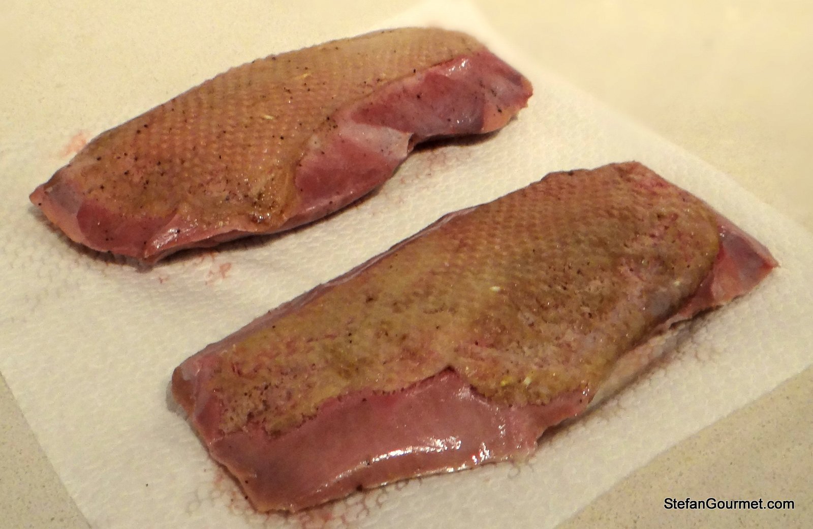 I patted the duck dry with paper towels to make it easier to crisp it up.