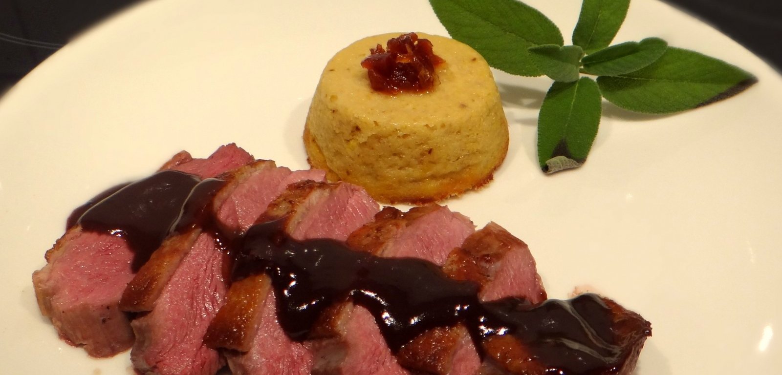 After yesterday’s post about duck stock, it won’t come as a surprise that today’s post features duck. I love duck meat and this duck breast with a demi-glace sauce made from duck stock and red wine was particularly nice. It also won’t be a surprise what my next post will be about, as the side dish (a butternut squash tartlet) will have a post of its own.