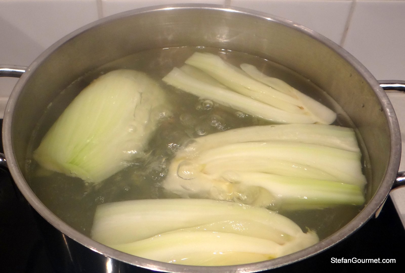 Parboil the fennel in salted boiling water for 10 minutes and then plunge them in cold water to stop the cooking.