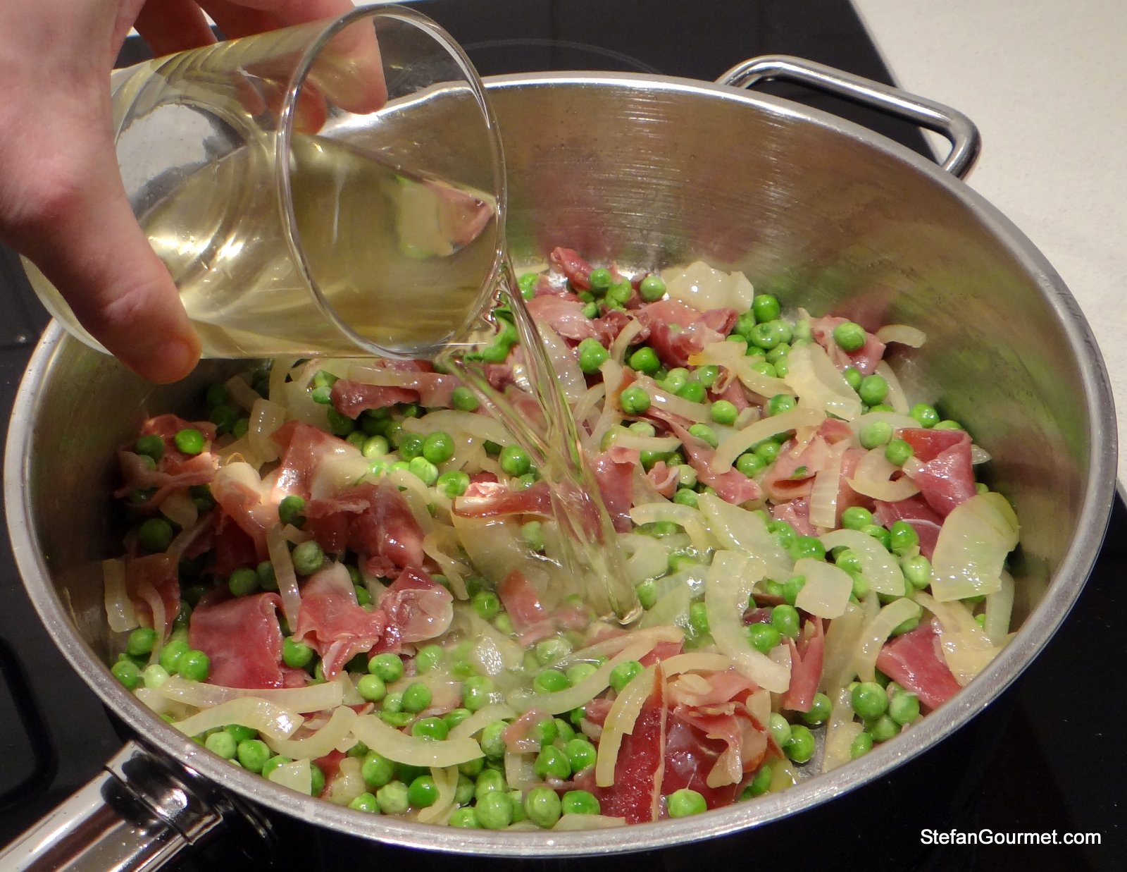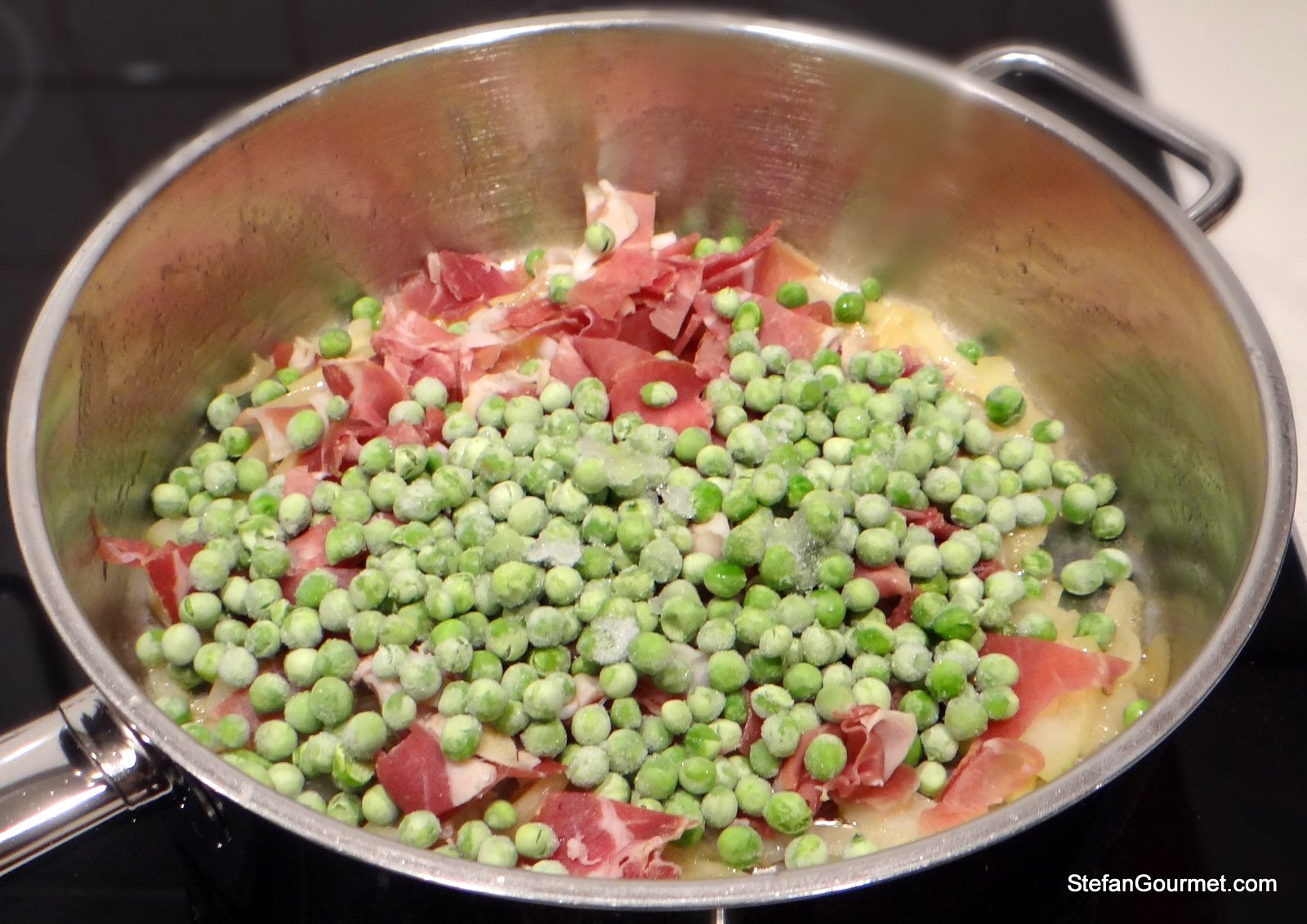 Add the prosciutto and the peas and increase the heat to medium. Stir for a minute.
