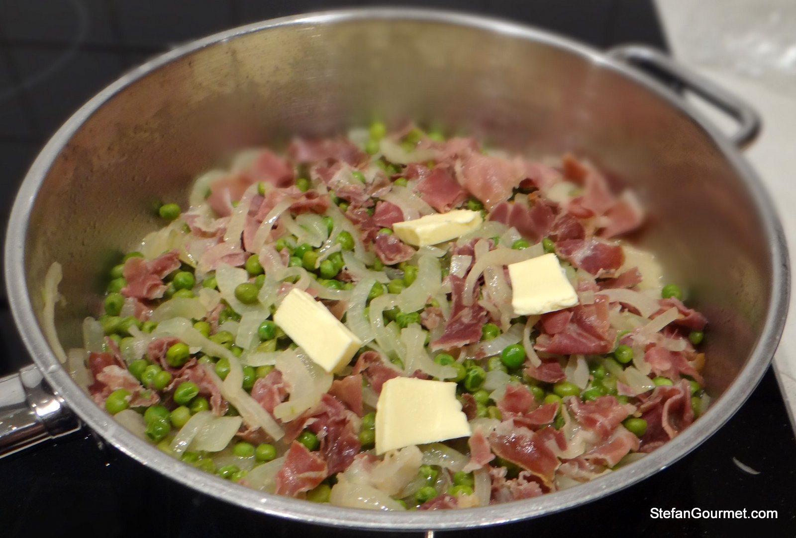 Meanwhile, add the remaining 15 grams (1 Tbsp) of butter to the peas and prosciutto and stir until the butter has melted.