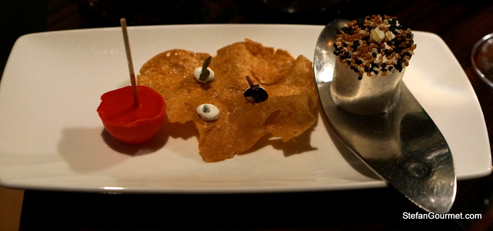 The first set of amuses included a quince lollypop, shrimp cracker, and beer foam with sesame seeds.