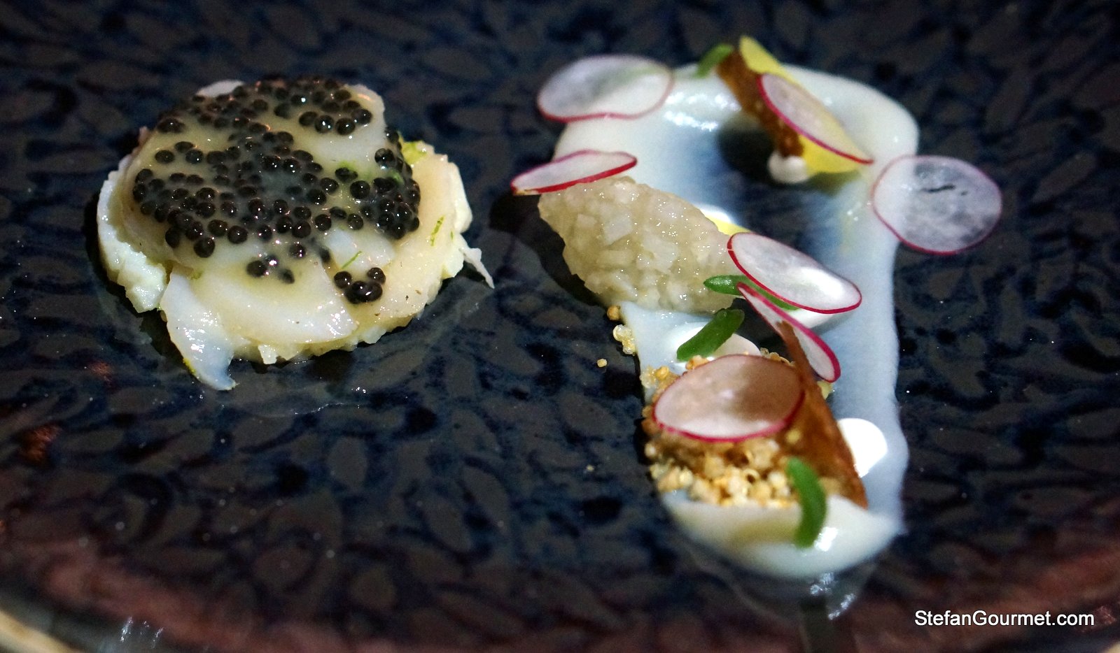 The first course of the menu: marinated scallop with cauliflower and caviar, cauliflower puree, apple, radishes, and something crispy.