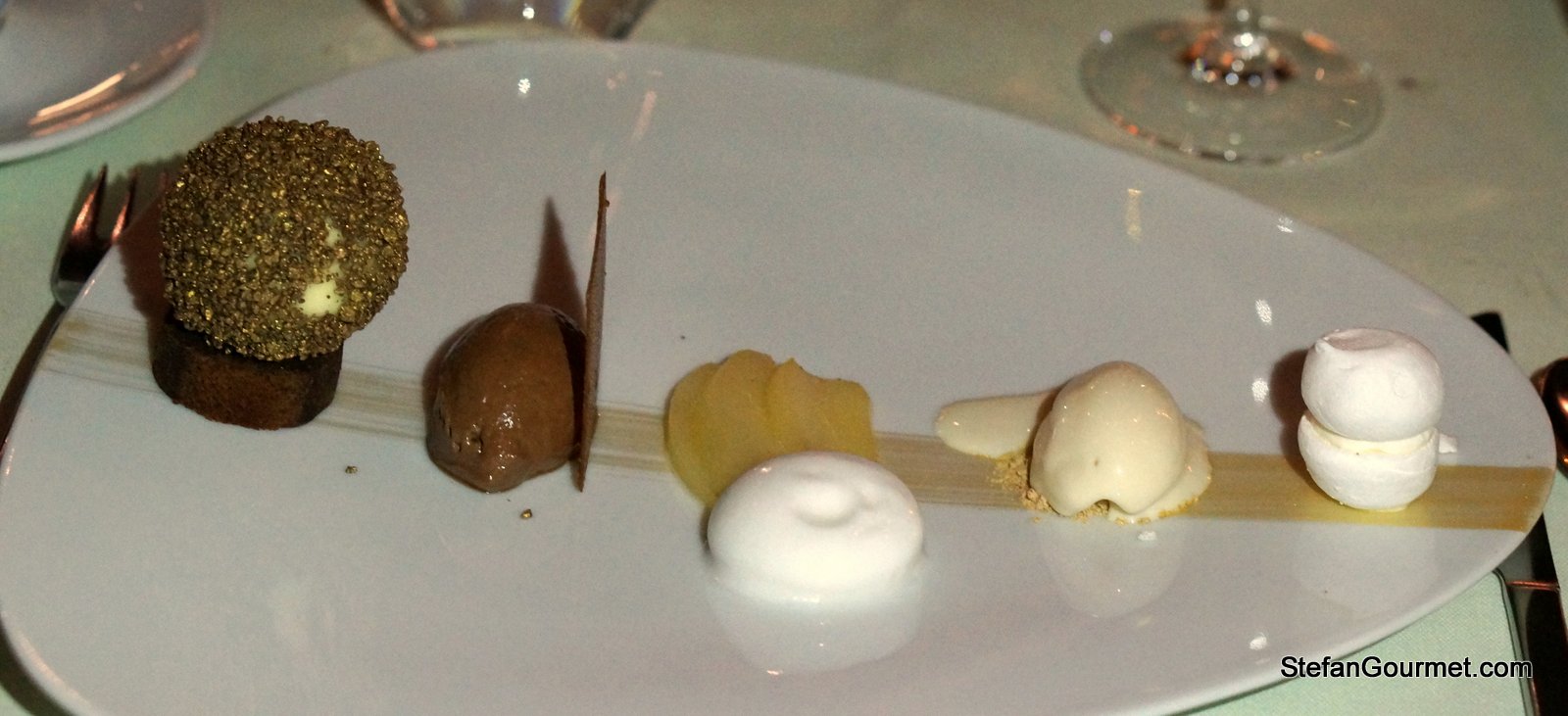 Fillet of roe deer with creamed beetroot, brussels sprouts, red cabbage, and onion raviolo, another classic dish. Perhaps it’s because I’m not a big fan of either brussel sprouts or red cabbage, but I wasn’t crazy about this. The roe dee was nicely medium rare, but it tasted more ‘gamey’ than I like (and roe deer doesn’t have to taste like that). It was first paired with a 2009 Ripasso from Veneto, but that had so much ‘green bell pepper’ (i.e. unripe grapes or stems) that we didn’t like it at all. Without any discussion it was replaced with a South African bordeaux blend that worked quite well. 8/10