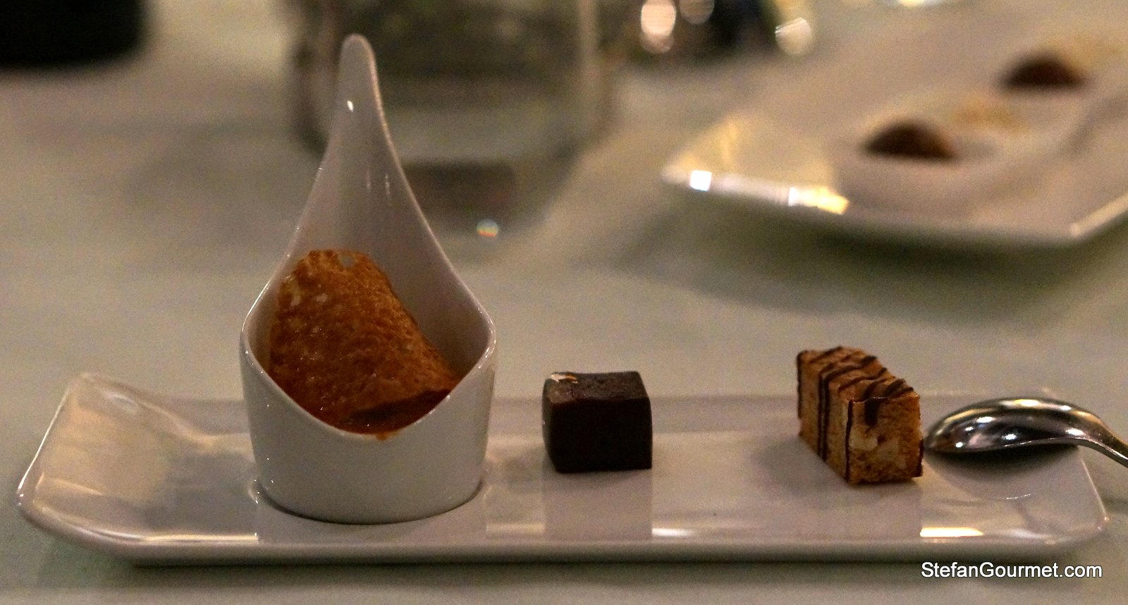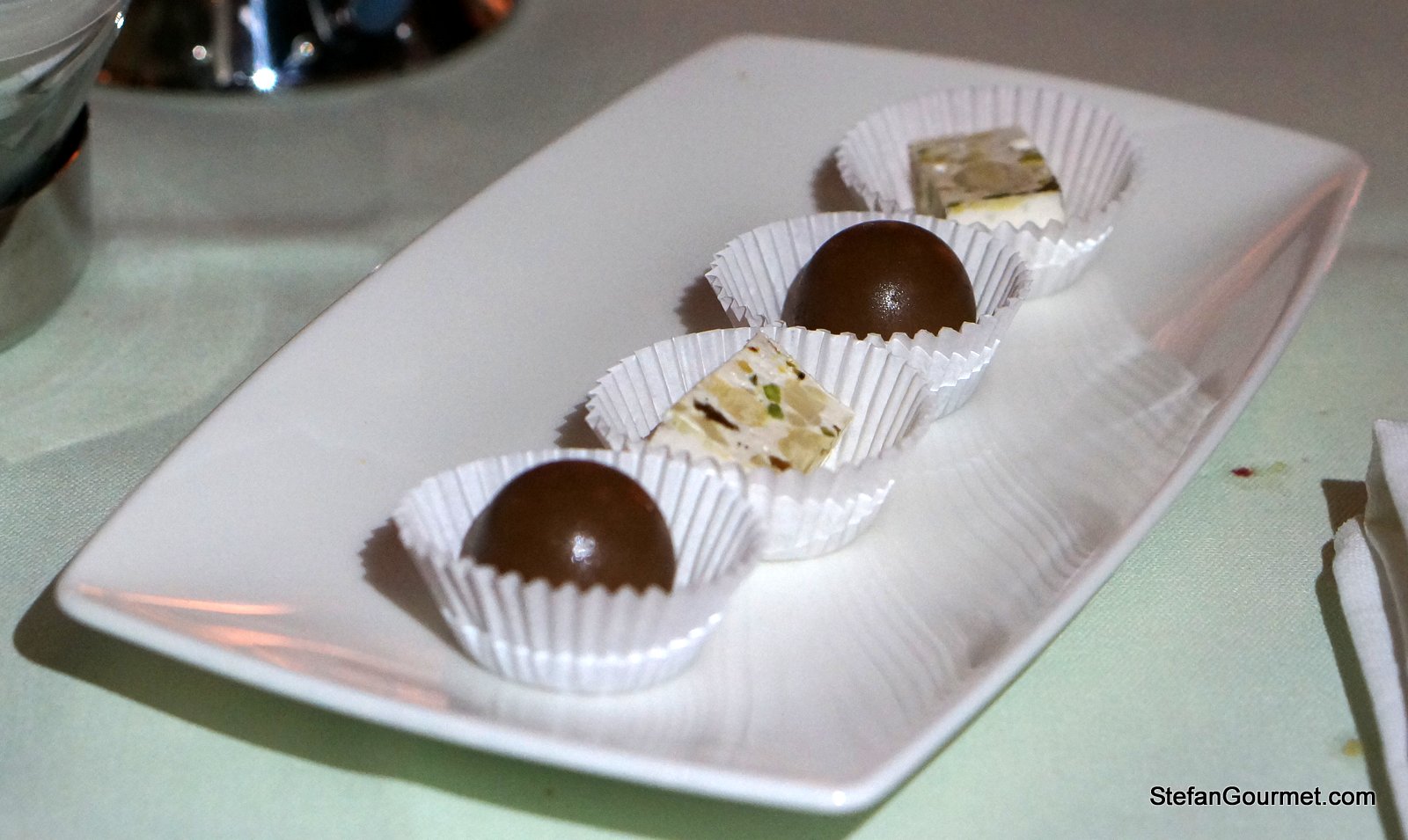 With the coffee came the sweets. Crème brulee, a bonbon and nougat.