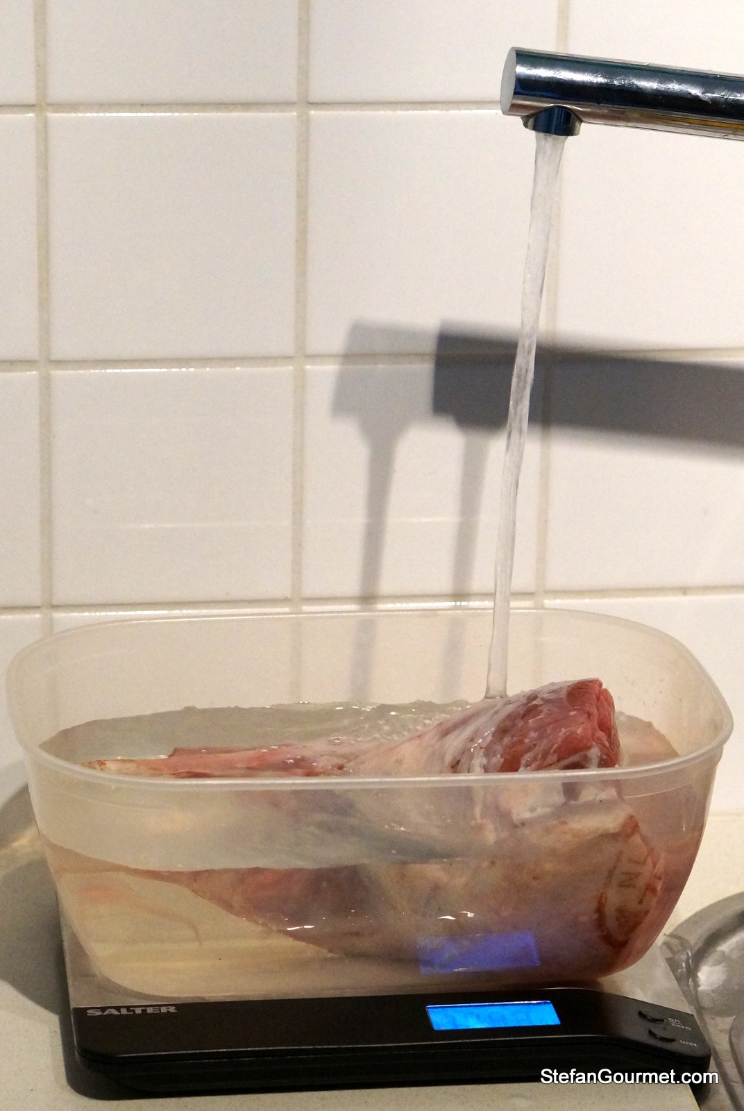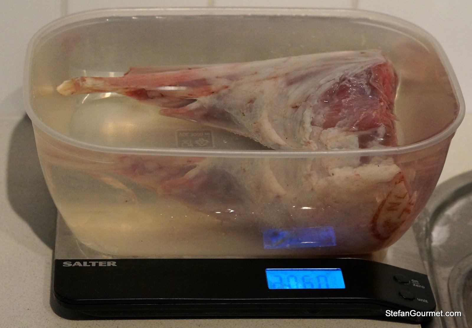 Measure the amount of water needed to cover the leg of lamb, in my cases 2060 grams of water.