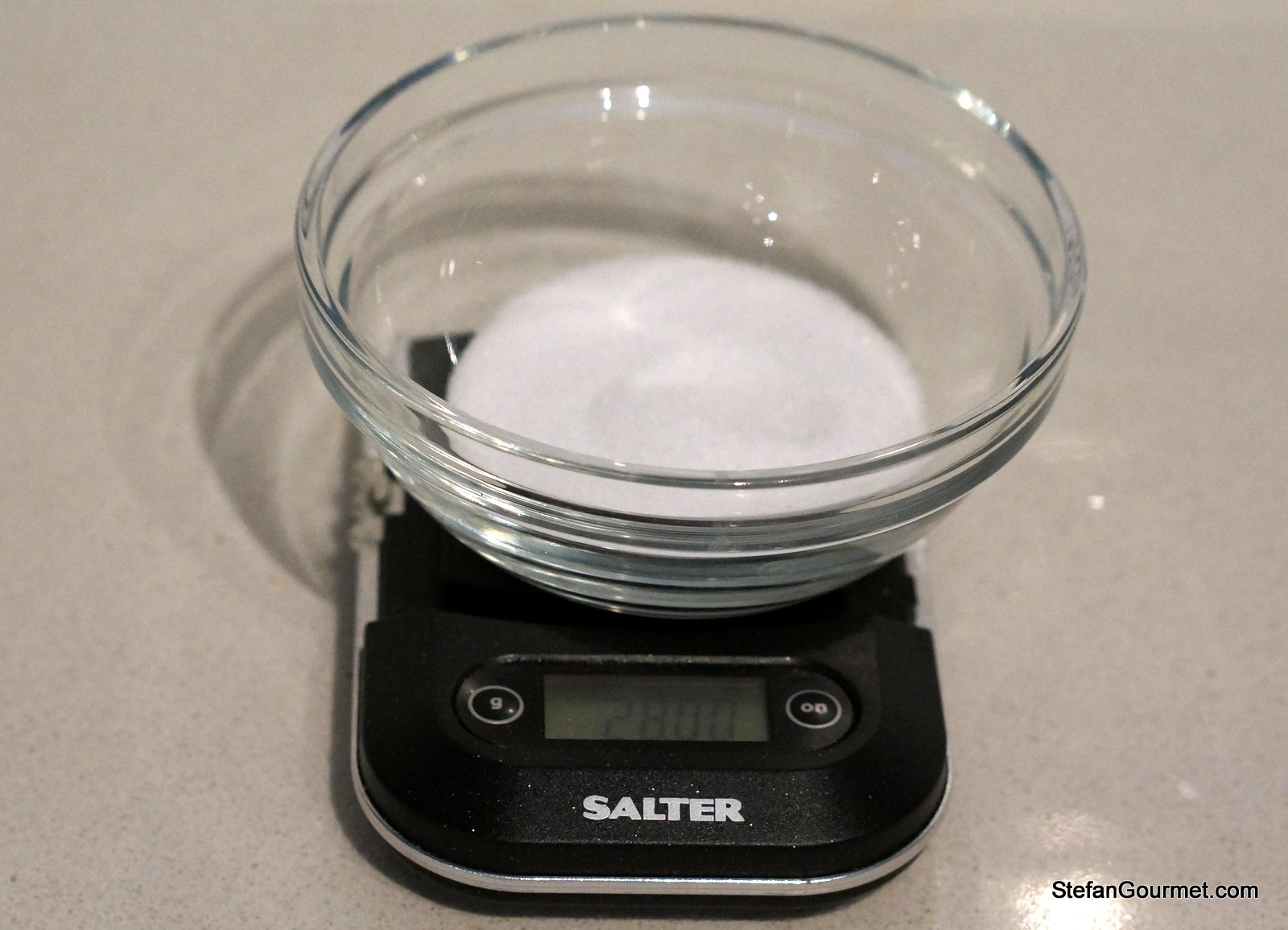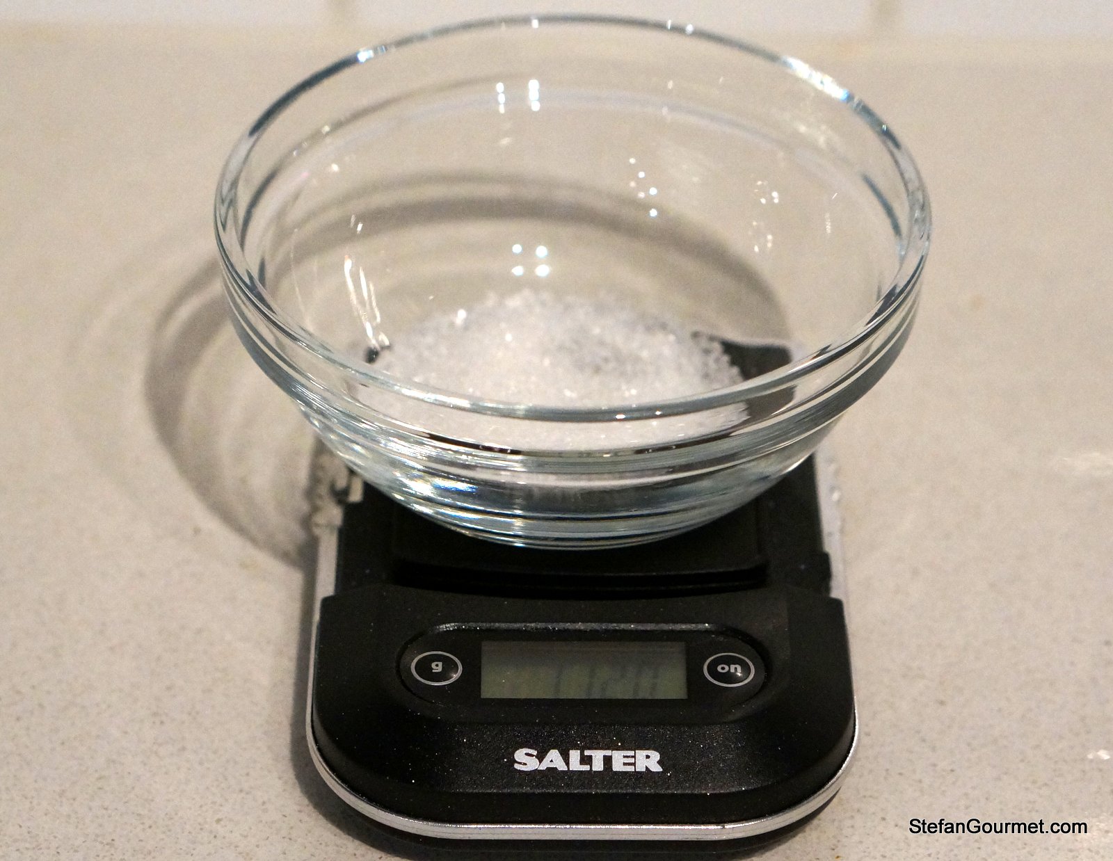 I wanted to have a saltiness of 1% by weight. With about 800 grams of lamb (estimated weight without the bone) and 2060 grams of water, 1% of that is 28 grams of salt.