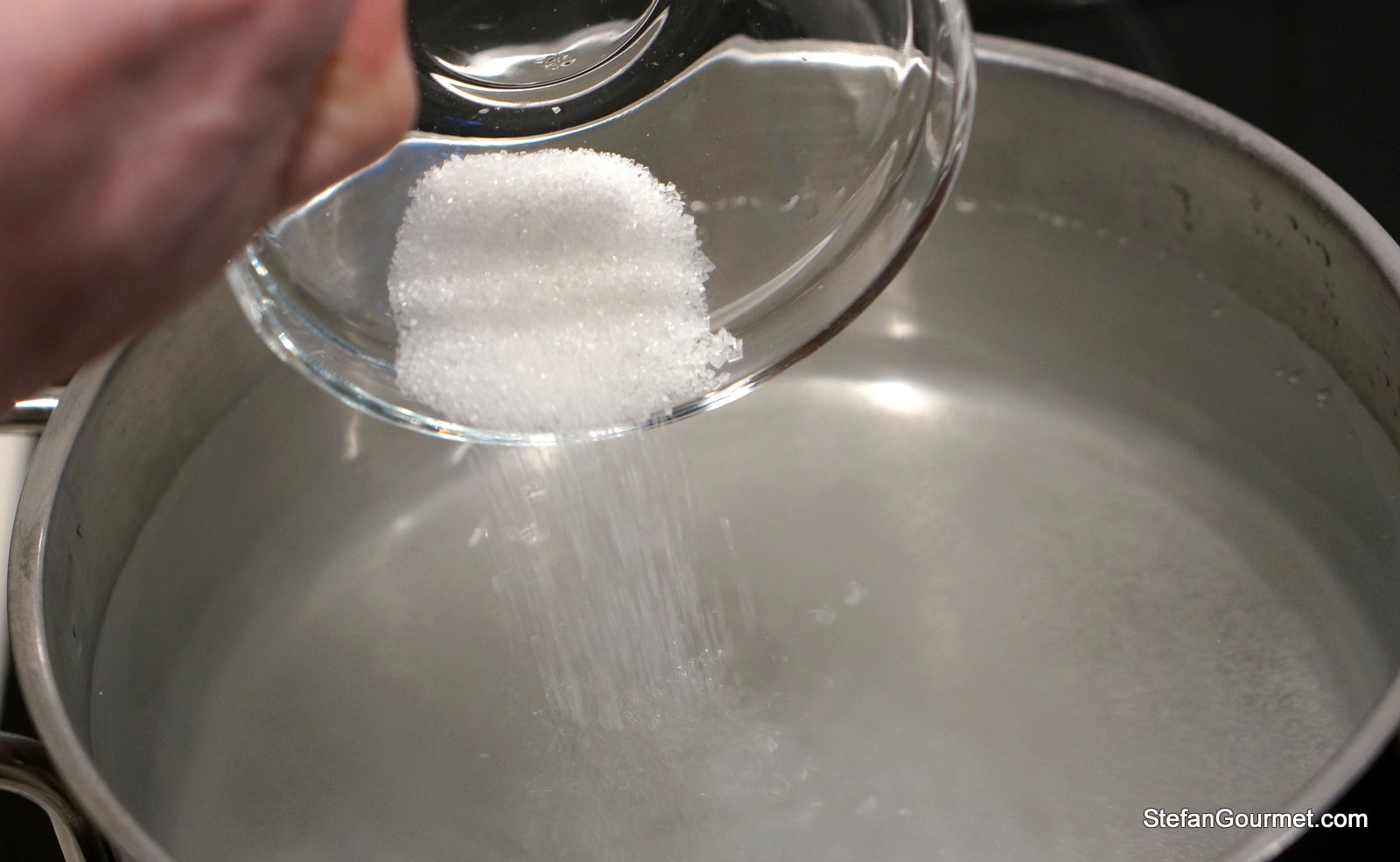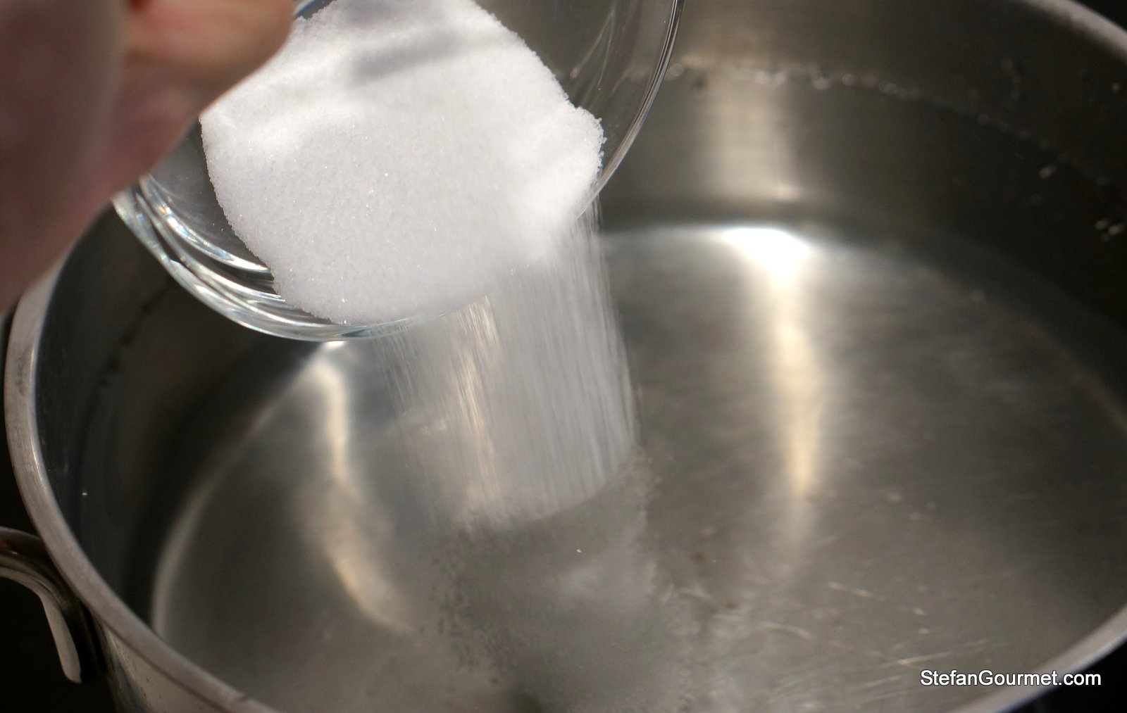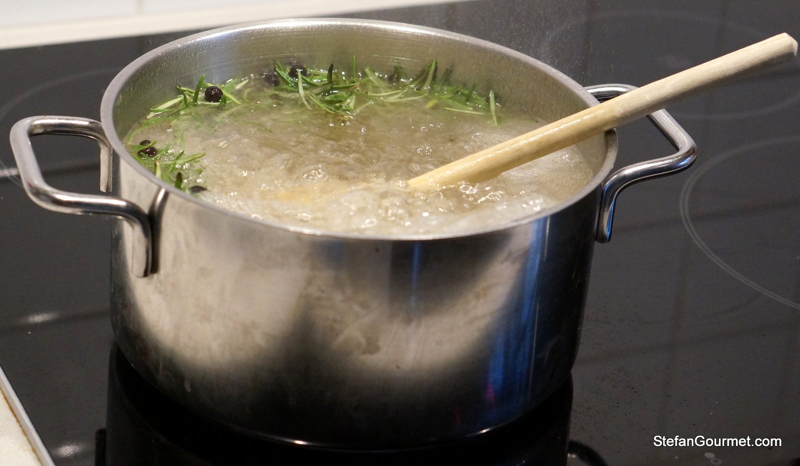 I brought this to a boil and then turned off the heat. Boiling the brine like this will sterilize it, and makes it easier for the salt and sugar to dissolve.