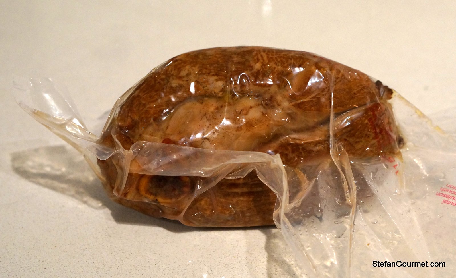 Then I closed the ham as best as I could and vacuum sealed it. I refrigerated the ham like this for 4 hours to allow the transglutaminase to do its job.